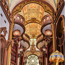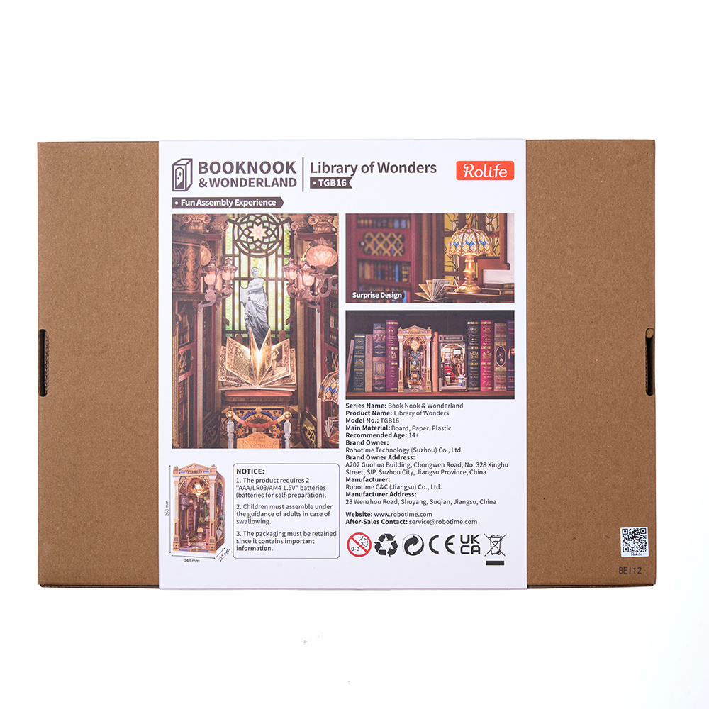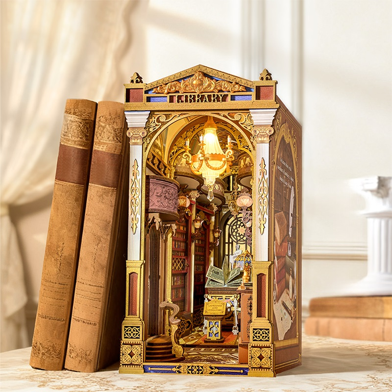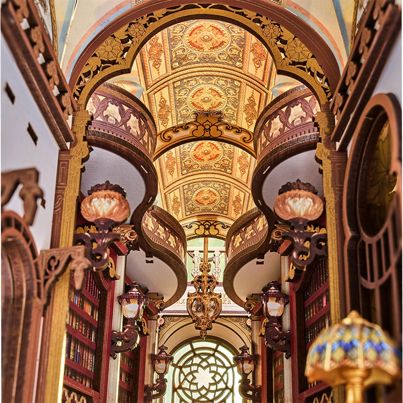Impozantní klenutá brána vás zve do prostoru plného nejen knih, ale i uměleckých detailů a bohaté výzdoby. Pod vysokým, zlatem zdobeným klenutým stropem se tyčí římské sloupy, zatímco červené dřevěné knihovny zaplňují každý kout. Balkon s výhledem na schodiště se zdobeným zábradlím je osvětlen svítícím lustrem a teplými závěsnými světly, která dodávají scéně útulnou atmosféru. Na vzdáleném konci haly se nacházejí klenutá okna s jemnou kružbou a uprostřed prostoru stojí mahagonový pult s otevřenou knihou plnou kaligrafie. Čtenářský koutek je zakončen střechou ve viktoriánském stylu a bočními panely inspirovanými pevnou knižní vazbou, které plynule navazují na okolní knihovny. Knihovna divů je ideální dekorací pro milovníky knih, historie a kreativního tvoření - okouzlující detail, který promění každou knihovnu v malé umělecké dílo.