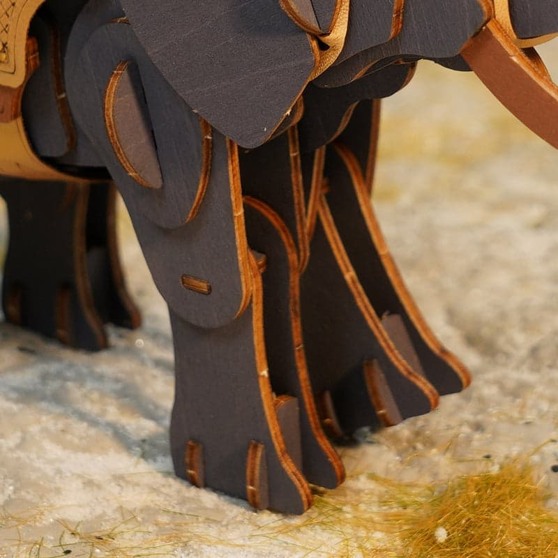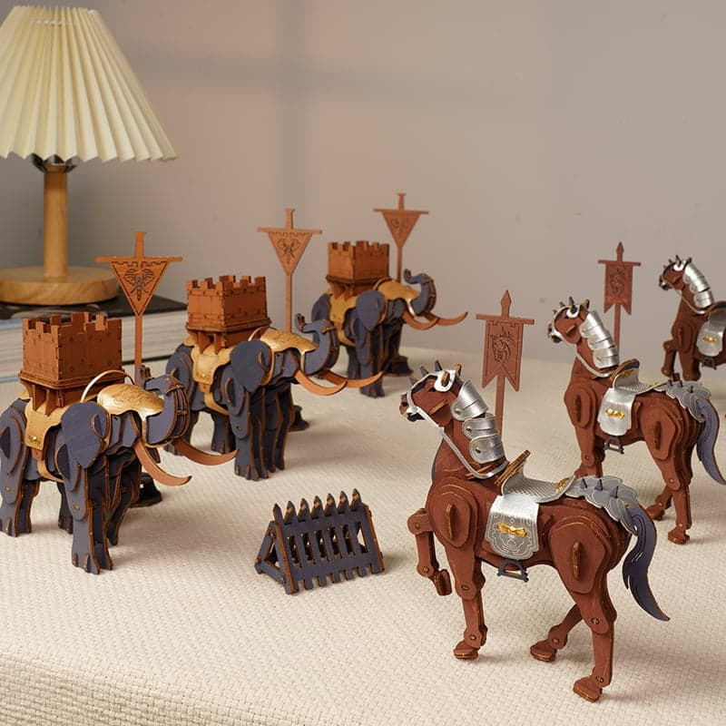 Vojsko je shromážděno a připraveno k boji! Tato dřevěná 3D skládačka slona Vám přinese spoustu zábavy při stavění a hraní. Přední končetiny slona jsou pohyblivé a dají se ohnout. Obličej, hřbet a břicho jsou pokryty zlatým brněním, které poskytuje všestrannou ochranu. Břišní část zbroje je navíc opatřena stylovými kovovými přezkami. Kromě samotného koně je součástí této skládačky také totemová bojová vlajka. Skládačka je dodávána v nesloženém stavu, balena v krabici. Vybaveno detailním návodem k sestavení. Výborně se doplňuje s Bojovým koněm (kód TWA01), Bojovným lvem (TWA03), Vlkem bojovníkem (TWA04). S nimi bude armáda neporazitelná! Případně mohou změřit své síly mezi sebou!