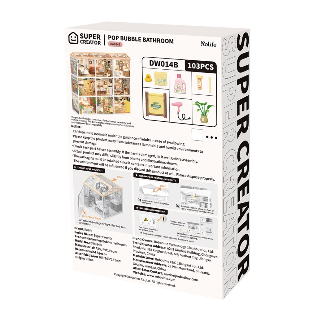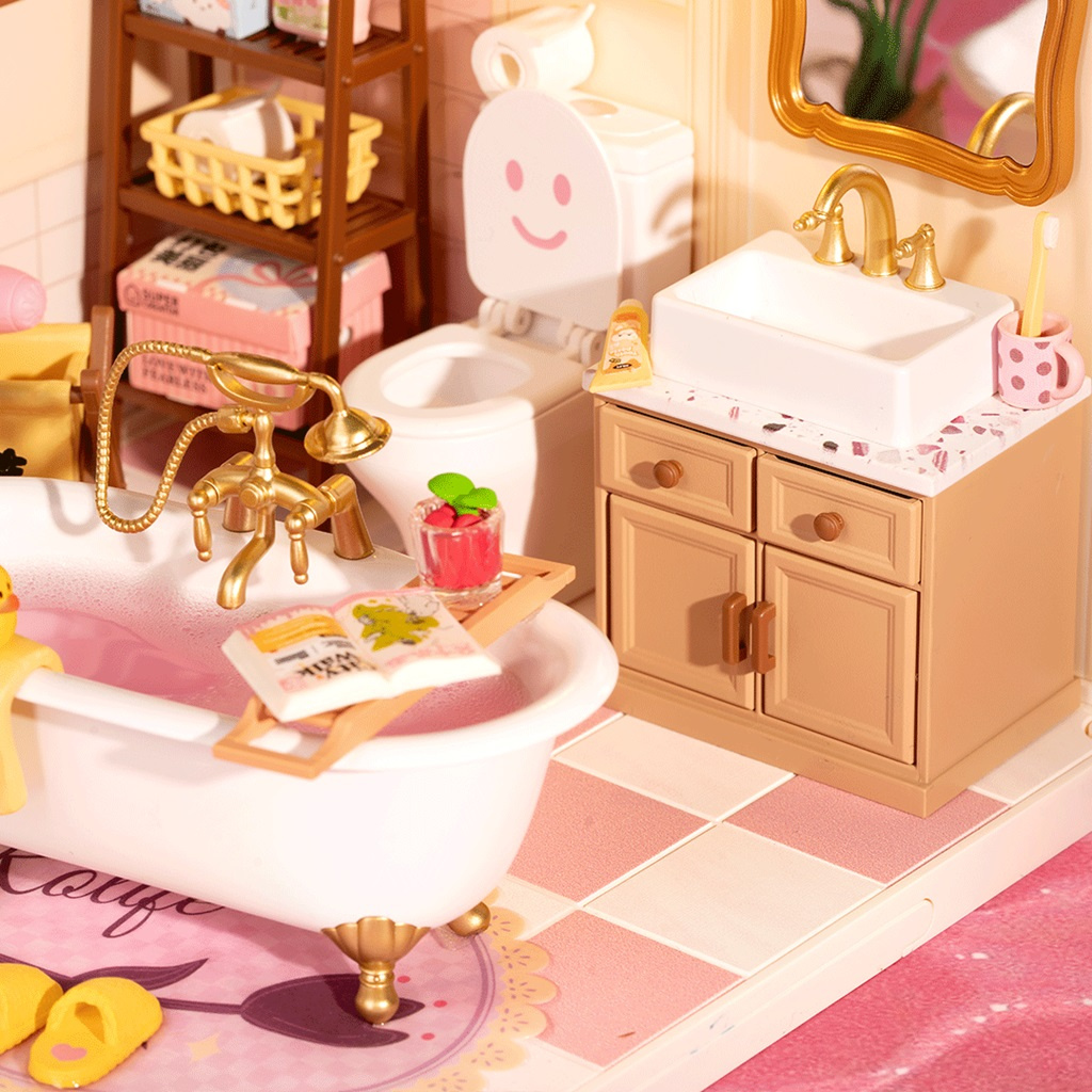 Představte si, jak si po náročném dni plném práce napustíte horkou vanu, připravíte si voňavou pěnivou koupel a užíváte si pocit pohody a uvolnění. Koupelna v kombinaci pastelově růžové a bílé barvy s vanou se zlatými nožičkami, toaletou s „usmívajícím se“ víkem a dalšími stylovými doplňky je kompletně vybavená všemi potřebnými drobnostmi, jako je fén, ručníky, bačkůrky a další nezbytnosti, např. roztomilá žlutá kachnička, noviny ke čtení i potřeby pro praní. Spojením různých miniatur řady Super Creator Series vertikálně nebo horizontálně můžete vytvořit různorodý komplex domečků. Ochraňte svůj výtvor pomocí krytů proti prachu a nečistotám – DWP05 Dveře proti prachu B a DWP02 Střecha typu B.