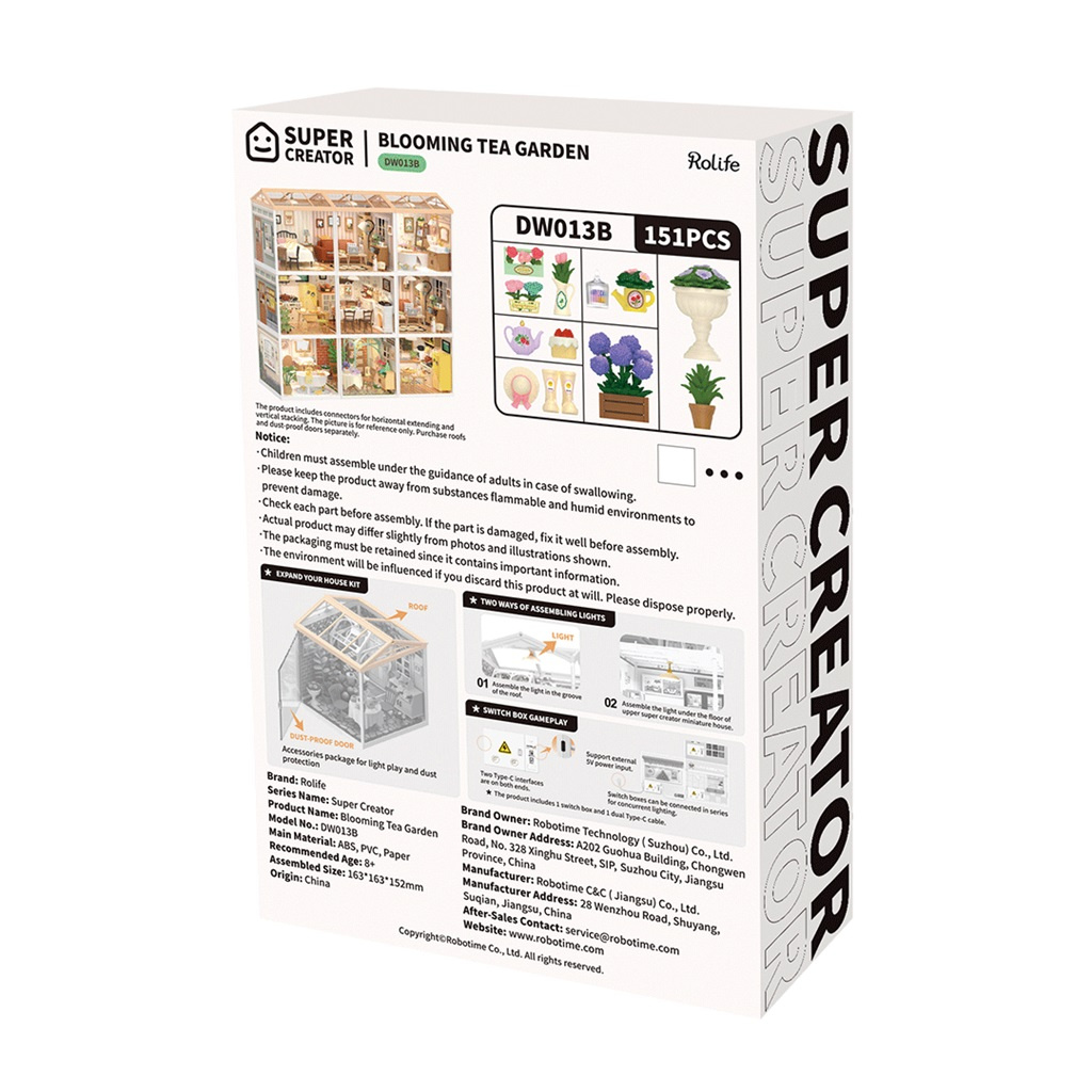 Navštivte zahradu se spoustou květin, kde byste mohli relaxovat, přemýšlet či si přečíst knihu, obdivovat vůni a barvy rozmanitých květin a popíjet svůj oblíbený čaj. Veškerý nábytek a doplňky včetně čajového stolku, květinových aranžmá, zelených rostlin či dveří je realisticky ztvárněn v živých barvách do nejmenších detailů. Toto příjemné zákoutí Vás naplní pocitem pohody a klidu. Spojením různých miniatur řady Super Creator Series vertikálně nebo horizontálně můžete vytvořit různorodý komplex domečků. Ochraňte svůj výtvor pomocí krytů proti prachu a nečistotám – DWP05 Dveře proti prachu B a DWP02 Střecha typu B.