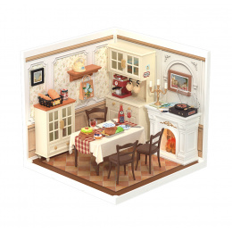 Kuchyň a jídelna jsou srdcem domova. U jídelního stolu se potkáváme se svými nejbližšími a u jídla si povídáme o životě, novinkách, svých zážitcích. Den začínáme šálkem kávy nebo čaje a snídaní a u jídelního stolu v kruhu rodiny náš den končí. Tento útulný jídelní kout v elegantním vintage stylu v krémové barvě s prostorným jídelním stolem je zobrazen do nejmenších detailů. Najdete zde příborník, stůl pokrytý ubrusem se 4 židlemi, pečivo, talířky, hrnečky, kávovar a další doplňky, které navozují atmosféru klidu a rodinné pohody, jako jsou obrázky na zdech, svícen či gramofon. Spojením různých miniatur řady Super Creator Series vertikálně nebo horizontálně můžete vytvořit různorodý komplex domečků. Ochraňte svůj výtvor pomocí krytů proti prachu a nečistotám – DWP05 Dveře proti prachu B a DWP02 Střecha typu B.