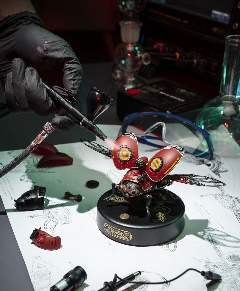 Originální mechanický brouk je připraven k průzkumnému letu! Nechejte se okouzlit atraktivním provedením a výbavou. Při jeho sestavování prověříte svůj důvtip, trpělivost a zručnost. Až budete s prací hotovi, můžete obdivovat, jak mává křídly a osvětluje okolí ve snaze vyhnout se nebezpečí. Na poličkách fanoušků science fiction a steampunku se bude zvláště vyjímat!