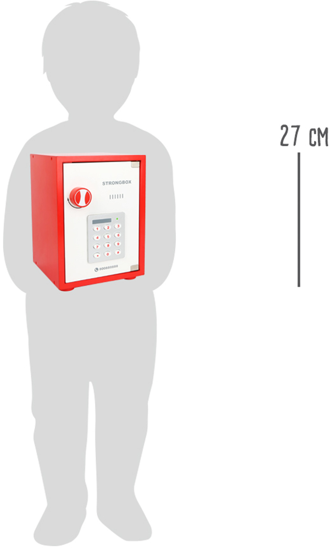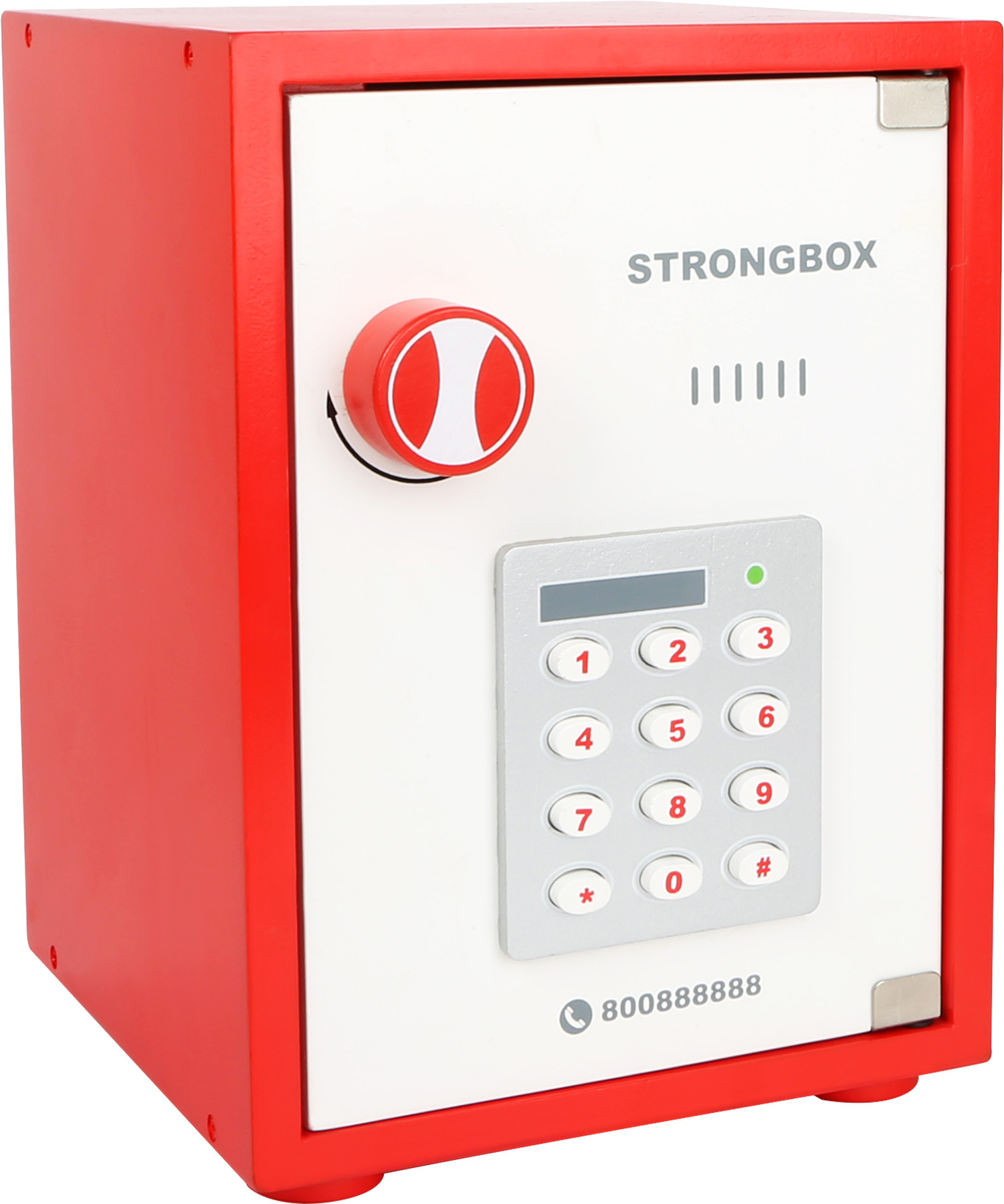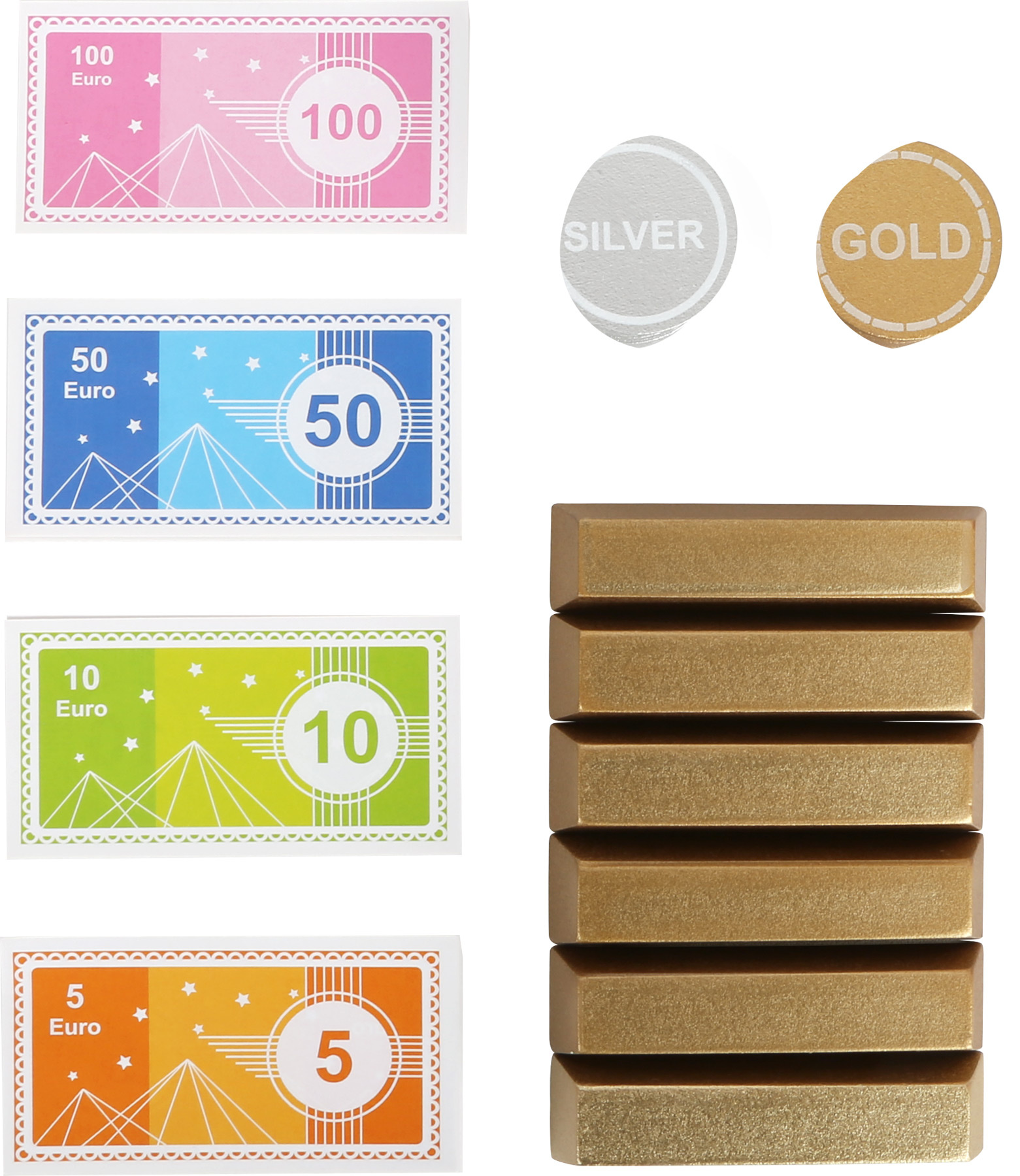 Bankéři a lupiči, pozor! Tento dřevěný sejf je opravdu něco! Při správné kombinaci se sejf otevře a odhalí svá tajemství – Euro bankovky, zlaté a stříbrné mince, ale i cihličky zlata (vyrobené ze dřeva). Otočný zámek vydává zvuk a tlačítka se dají mačkat.