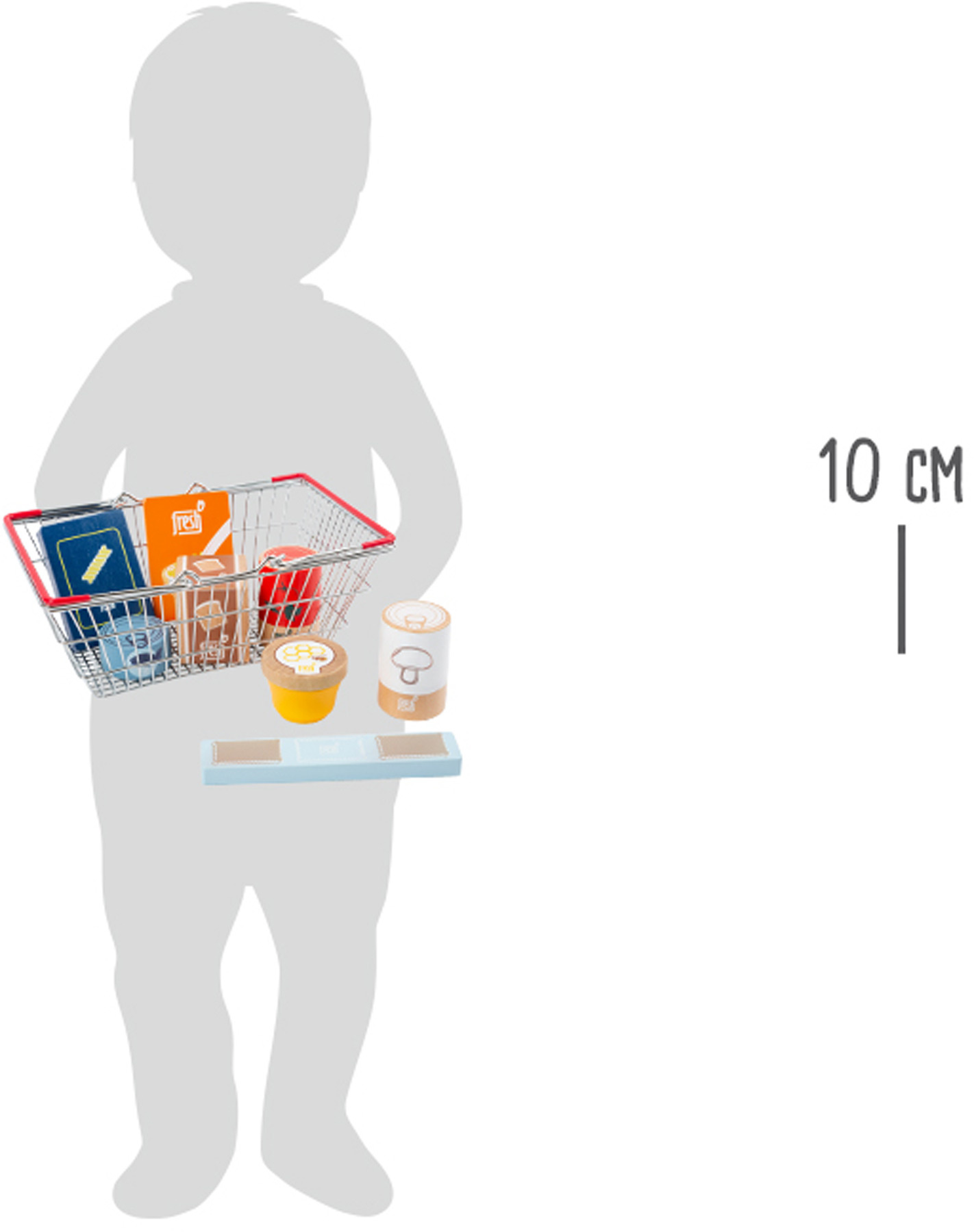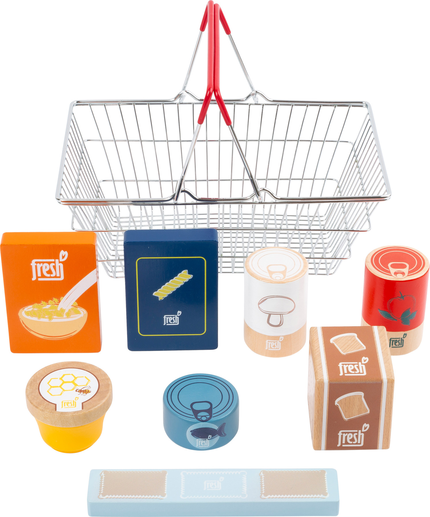 Je čas nakoupit potraviny do spíže! Sada obsahuje vícezrnný chléb, kukuřičné lupínky, těstoviny, konzervu tuňáka, rajčatovou omáčku a houby v plechovce, sušenky a sklenici medu. A vše ze dřeva! S kvalitním kovovým nákupním košíkem je nákup v obchodě rychle hotový!