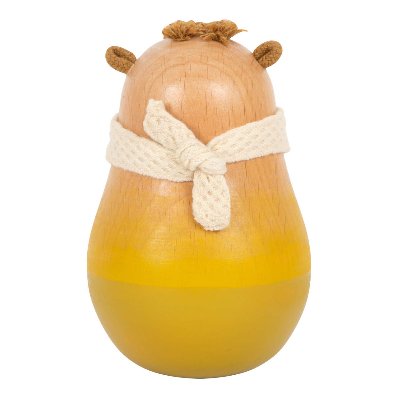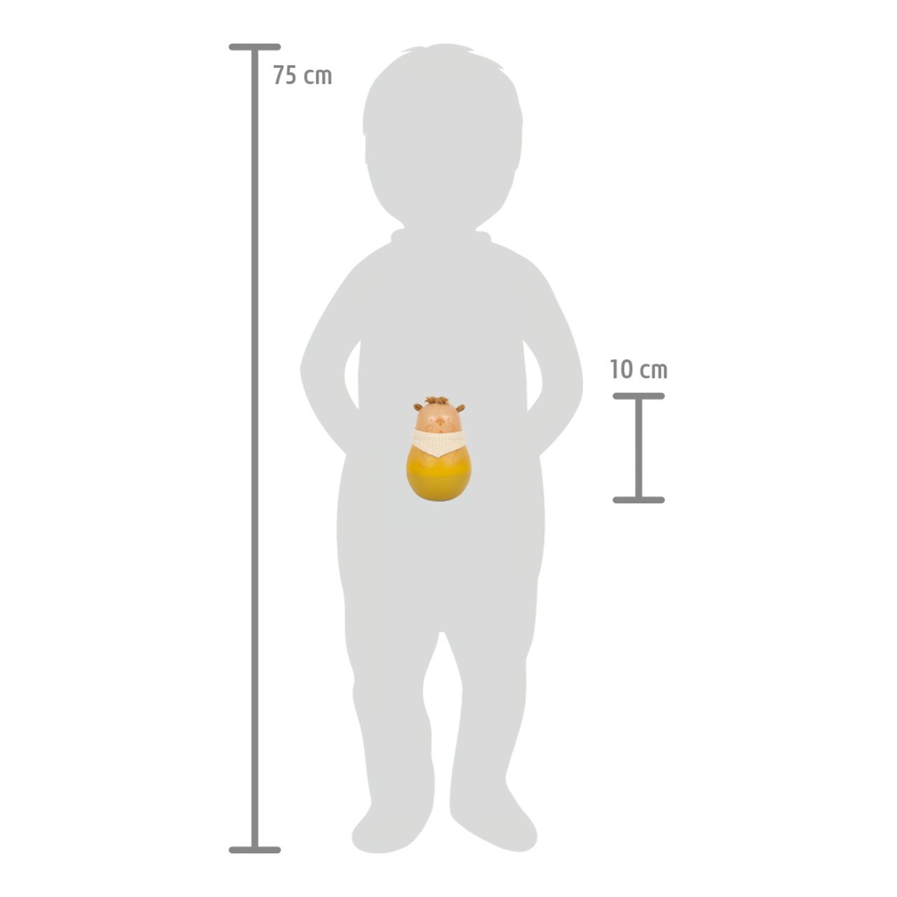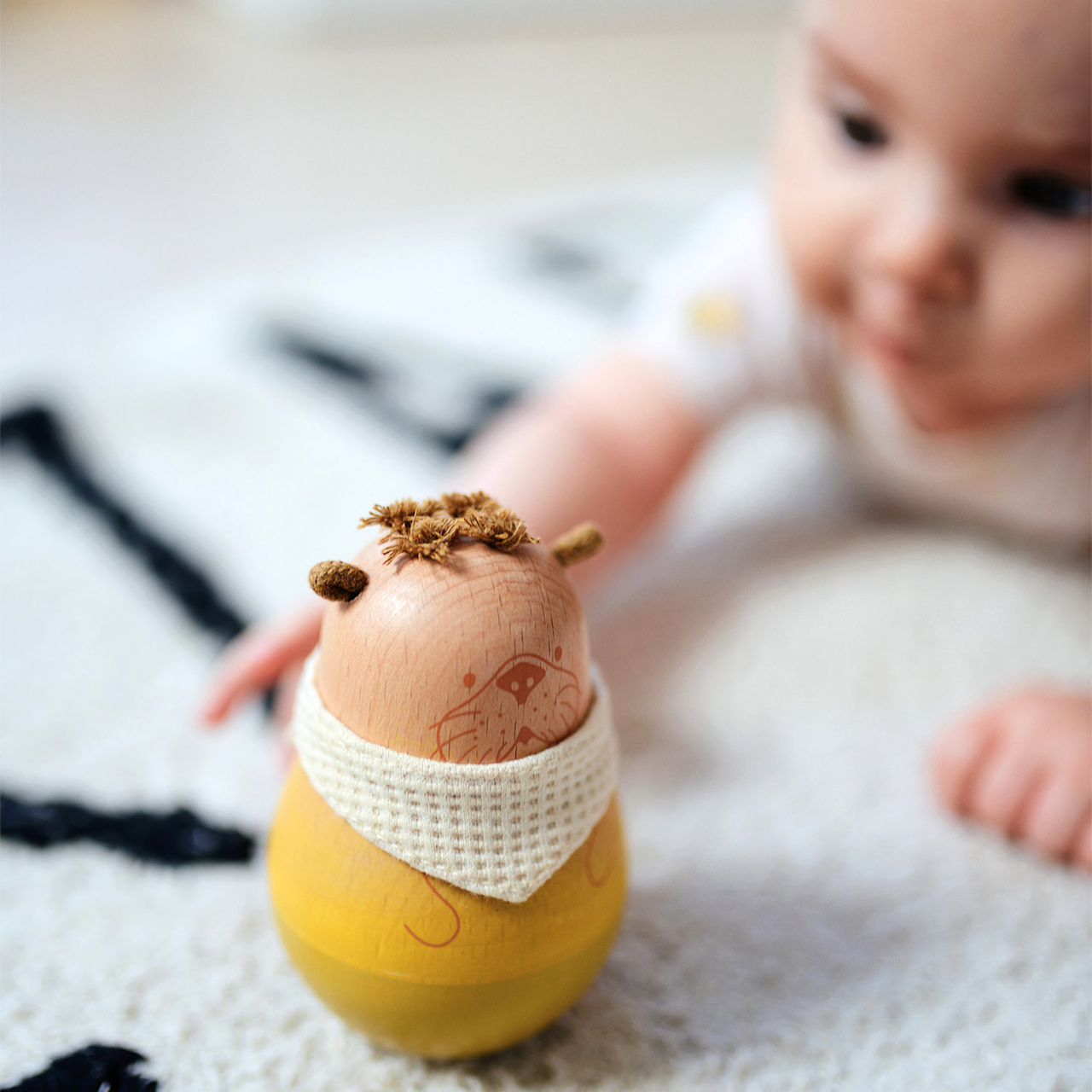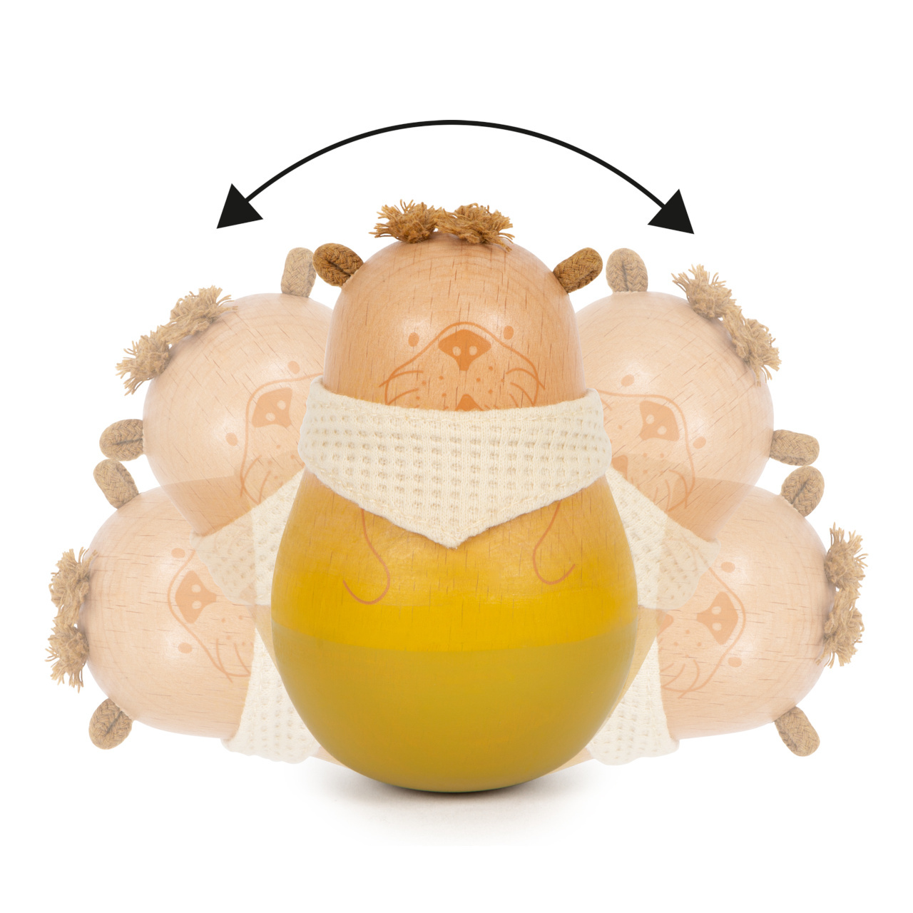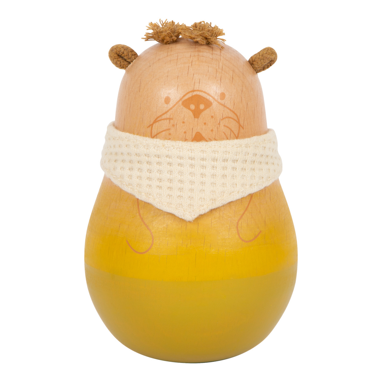 Tuto hračku si zamilujete! Roztomilá vydra v přírodních barvách bude vaše děti fascinovat. Je to senzorická hračka, která vydává zvuk díky integrované rolničce, při postrčení se také sama opět postaví. Srst na hlavě a uši jsou bavlněné, šátek kolem krku je z vzorované žerzeje, děti zapojí kromě sluchu i hmat.