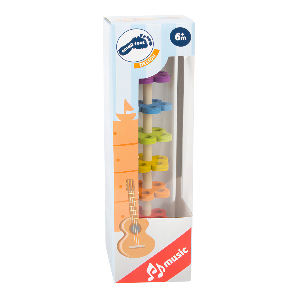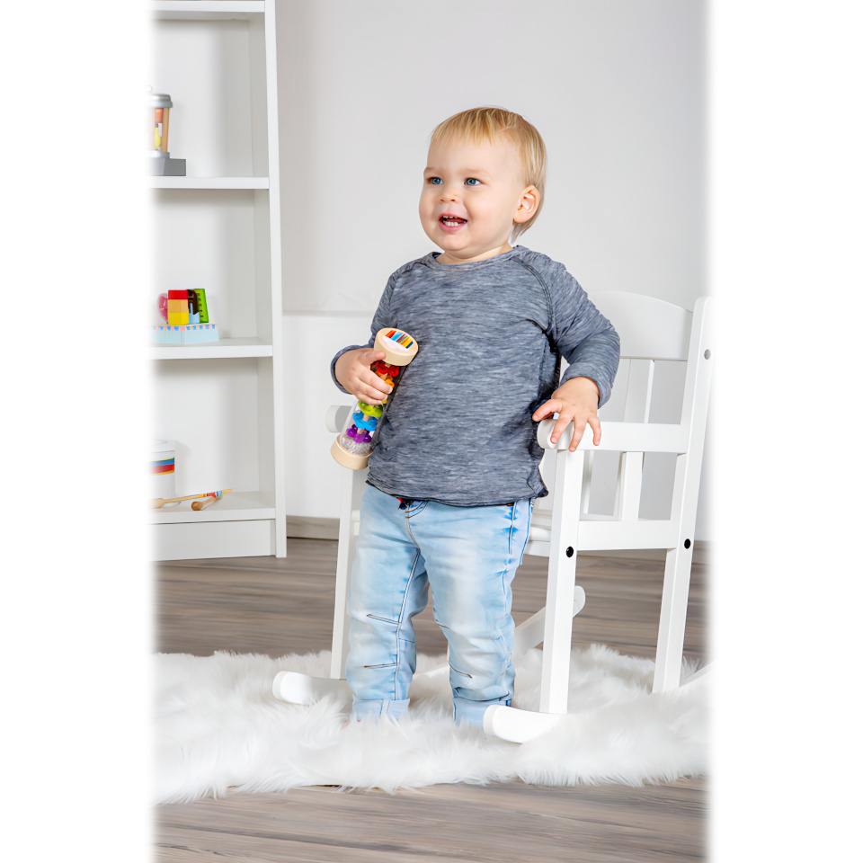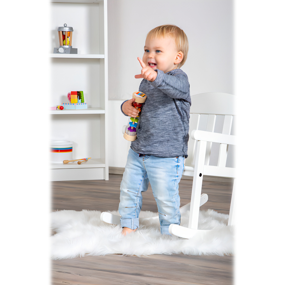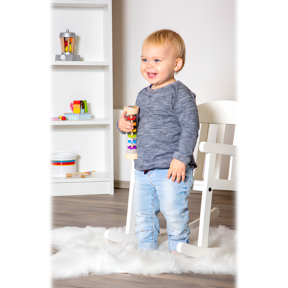 Tak přesně takhle zní déšť! S dešťovou holí můžete imitovat zvuky jemného deště. Můžete ji použít jako chrastítko, rytmickou hračku. Tělo hračky je průhledné, můžete tak pozorovat jak se kuličky pohybují přes zábrany ve tvaru květin.