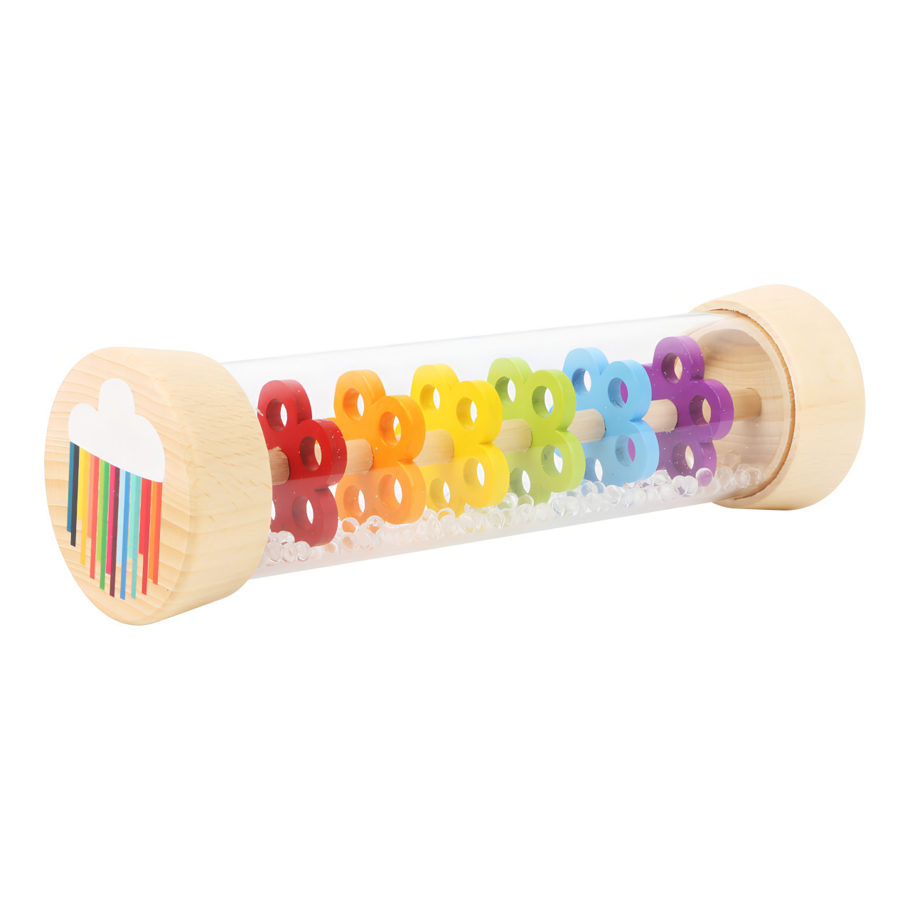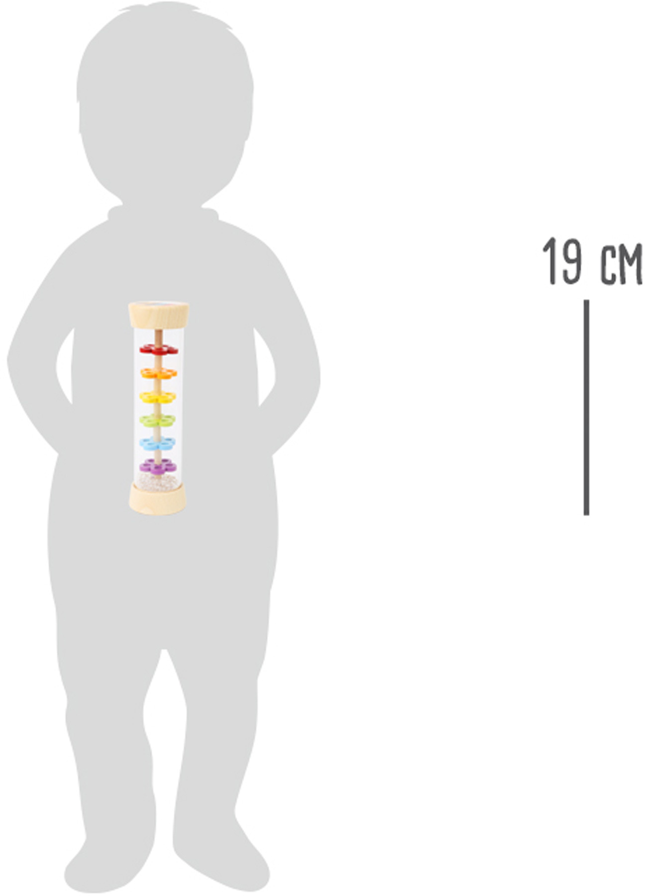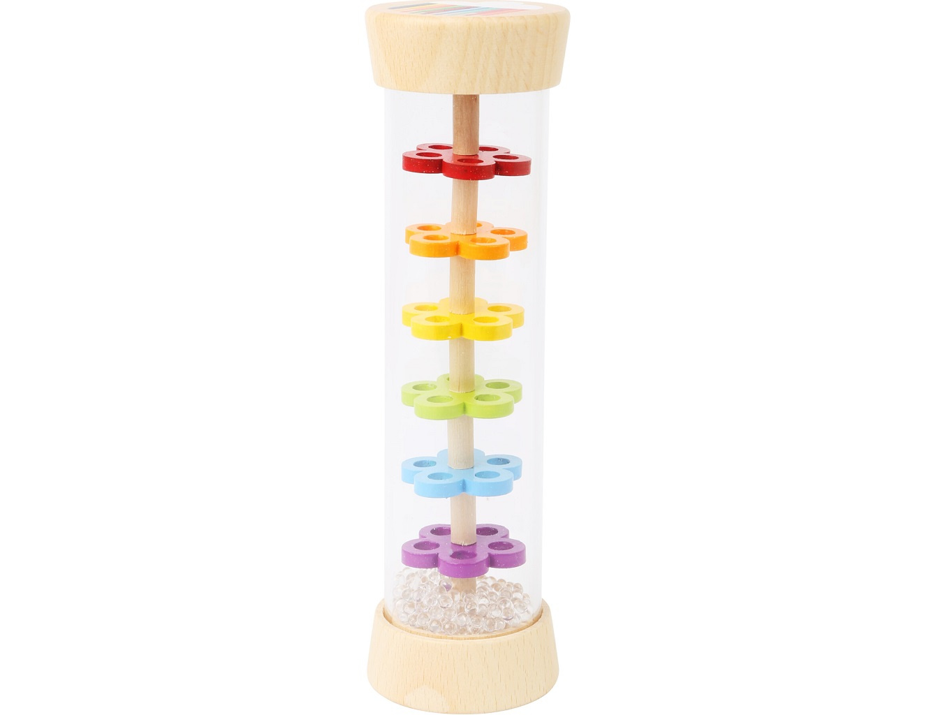 Tak přesně takhle zní déšť! S dešťovou holí můžete imitovat zvuky jemného deště. Můžete ji použít jako chrastítko, rytmickou hračku. Tělo hračky je průhledné, můžete tak pozorovat jak se kuličky pohybují přes zábrany ve tvaru květin.