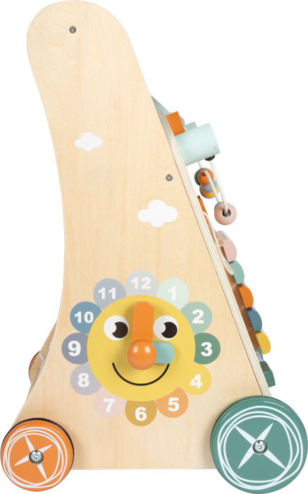 Vydejte se na safari a prozkoumejte svět! Toto stabilní chodítko se třemi stěnami s aktivitami v designu safari nabízí velké množství herních prvků, které podněcují všechny smysly, a doprovází malé průzkumníky při jejich prvních krůčcích. Se slonem, krokodýlem, tukanem, lvem, tygrem, zebrou a jejich přáteli bude každý krok novým dobrodružstvím. Dřevěný xylofon s 5 klávesami poskytuje akustickou stimulaci, zatímco četné posuvné prvky a korálkový labyrint s různě velkými barevnými korálky trénují jemnou motoriku. Ozubená kola, překlápěcí destičky, vkládačka se 3 různými kostičkami a hodiny s pohyblivými ručičkami nabízejí nejen zábavu ale také učení prostřednictvím hry. Síť na zadní straně chodítka poskytne praktický úložný prostor na hračky. Kola mají gumové kroužky navržené tak, aby zabraňovaly prokluzování a umožňovaly tichou a plynulou jízdu. Chodítko je stabilní také díky trojúhelníkovému tvaru a pro své barevné provedení v jemných pastelových barvách s velkým množstvím přiznaného přírodního dřeva se stane atraktivním doplňkem každého dětského pokojíčku. Skvěle se hodí k ostatním hračkám z produktové řady Safari.