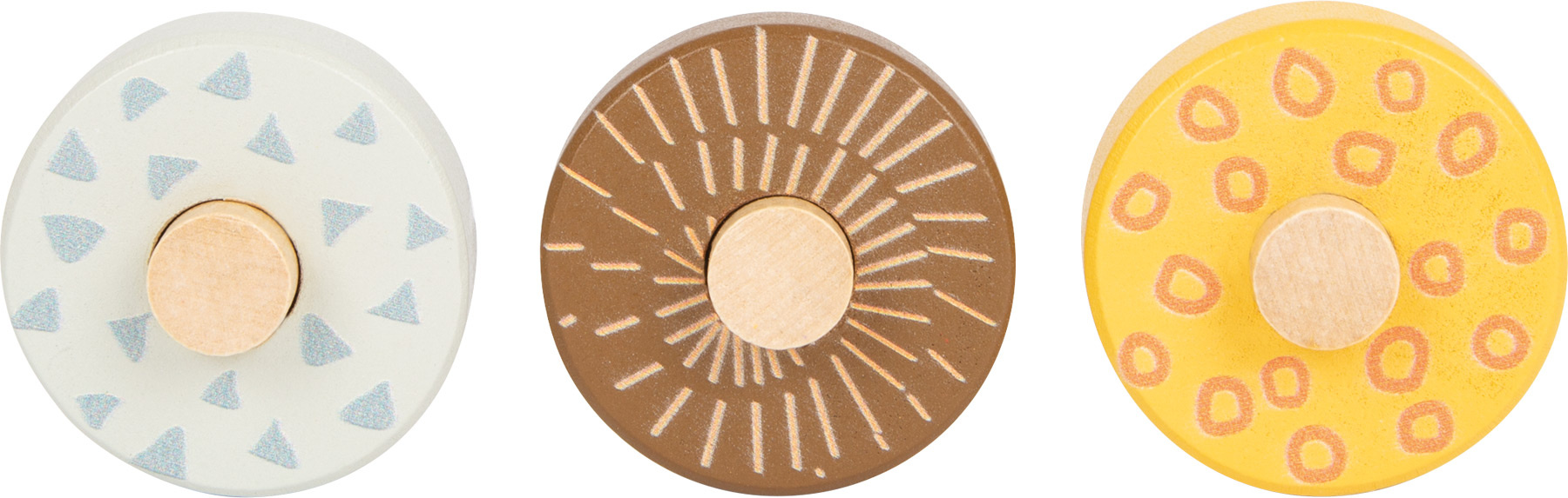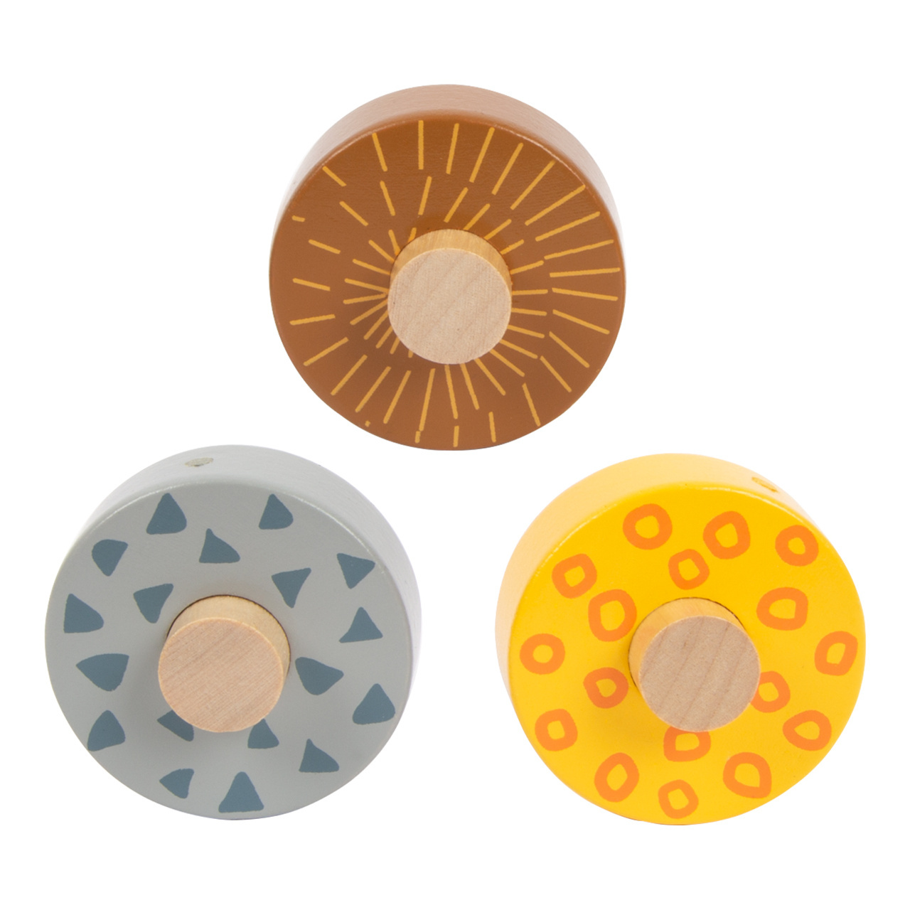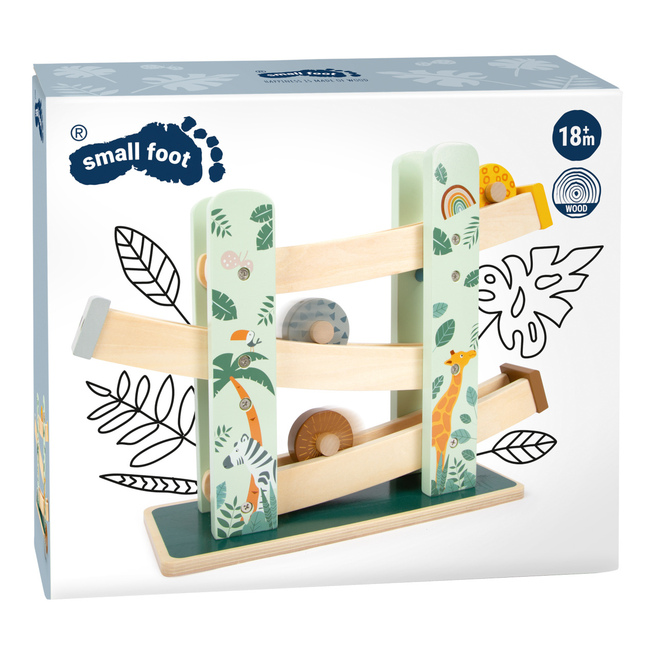 Kutálejí se přírodou, nabírají rychlost. Tři dřevěná kolečka s rozdílnou ilustrací a vzory se kutálí dolů po třech rampách. Dráha je dekorována ilustracemi safari zvířat a rostlin z džungle. Krásná hračka, která slibuje dlouhotrvající zábavu.