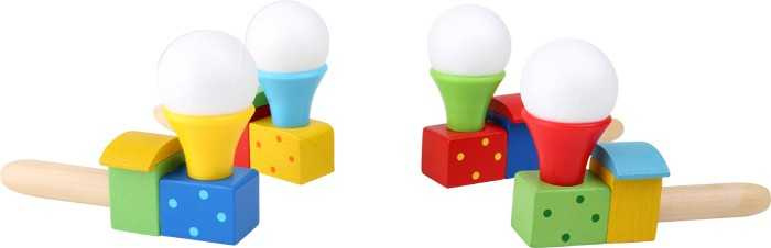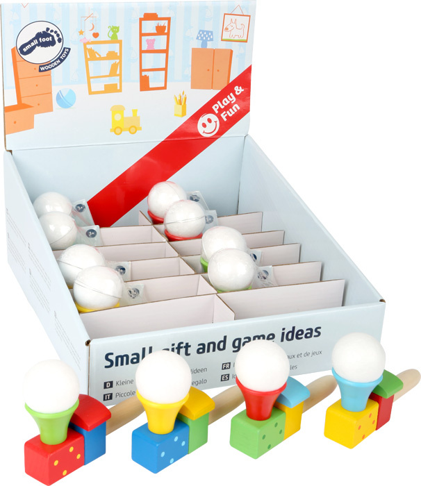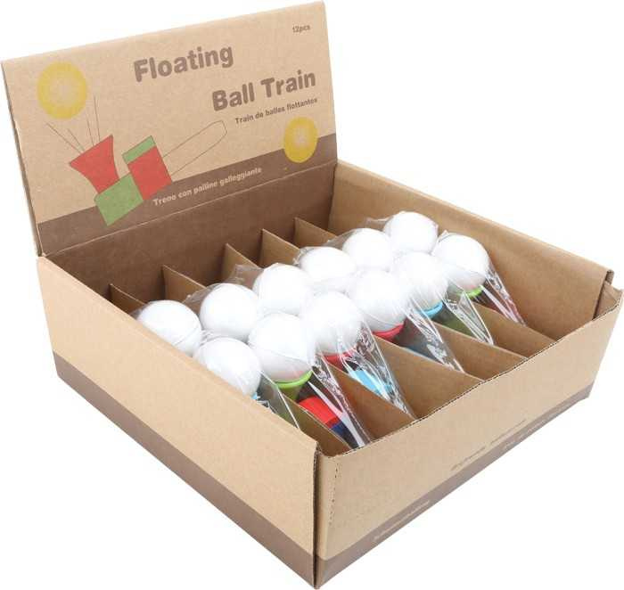 Blíží se vlak! Malá dřevěná trubička dopravuje vzduch komínem k polystyrénové kuličce a ta se díky tomu vznáší ve vzduchu. Intenzita foukání ovlivní, jak vysoko míček vyletí. Může sloužit jako pomůcka při dechových cvičeních.