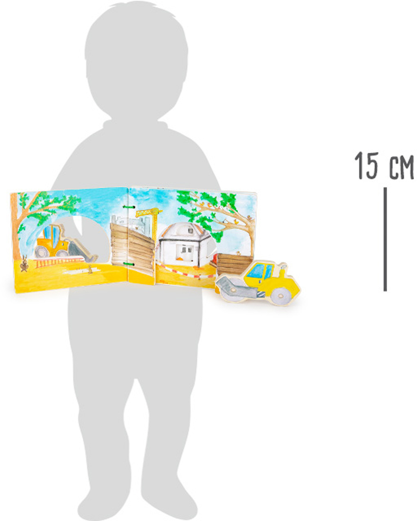 Na staveništi je tolik věcí, které děti mohou prozkoumat! S touto interaktivní knížkou vyrobenou z FSC certifikovaného dřeva se děti naučí jak to chodí na stavbě. Vydají se na dobrodružnou cestu se žlutým válcem a bagrem. Po dočtení knížky mohou děti figurky strojů vrátit zpět do knihy. Naučná kniha, která rozvíjí představivost a vypravěčství u dětí.