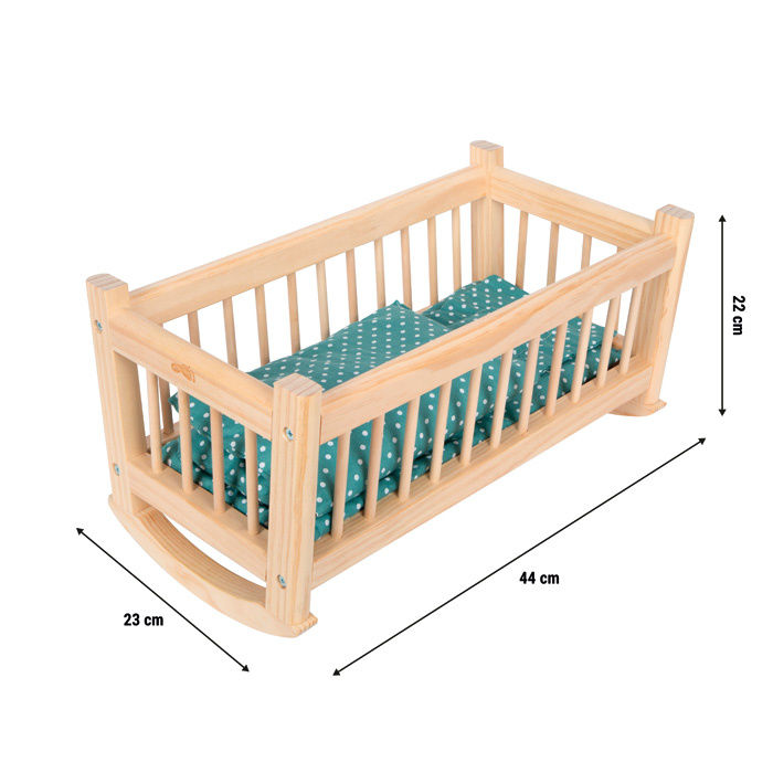 Když jsou oblíbené panenky a plyšáci unavení, přichází na řadu večerní rituál – stejně jako u skutečných rodičů. Přírodní vzhled dřeva a nadčasový design dělají z této kolébky pro panenky stylový doplněk každého dětského pokoje. Díky zaobleným hranám, pevné konstrukci a klasickému tvaru kolébky spojuje bezpečnost s přirozeným vzhledem. Součástí je sladěné ložní prádlo – velká deka, polštář a prostěradlo, které zajišťuje maximální pohodlí a vybízí děti k dlouhému a kreativnímu hraní. Jemné houpání pomáhá panenkám i plyšákům usnout a zároveň podporuje rozvoj dětské fantazie. Při hře na rodiče si děti přirozeně osvojují péči, každodenní rituály i sociální dovednosti. Houpací pohyb navíc rozvíjí jemnou motoriku a cit pro rytmus. Kvalitní zpracování a stabilní konstrukce zaručují dlouhou životnost a spoustu zábavy. Perfektní doplněk do každého dětského pokojíčku i k dalšímu nábytku pro panenky.