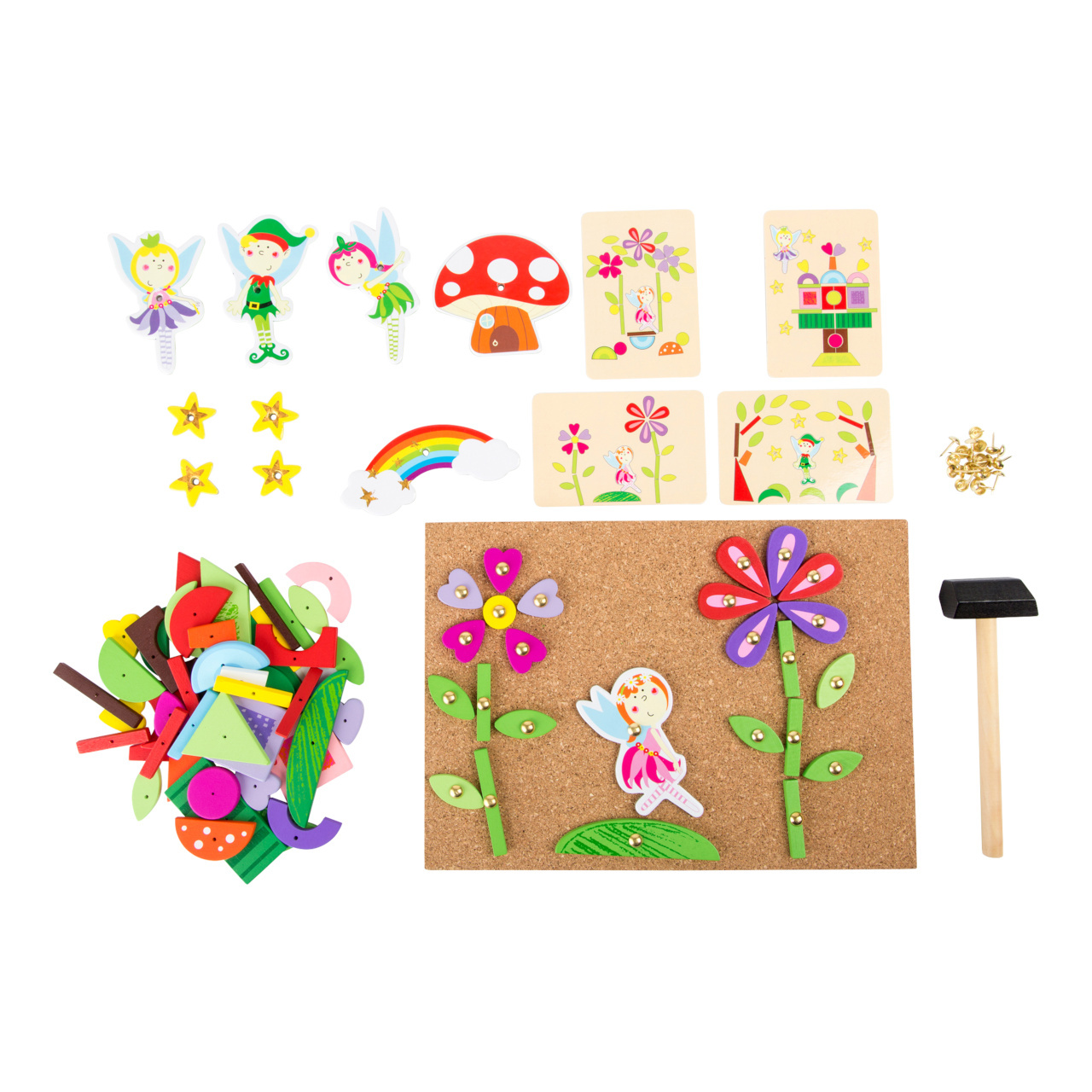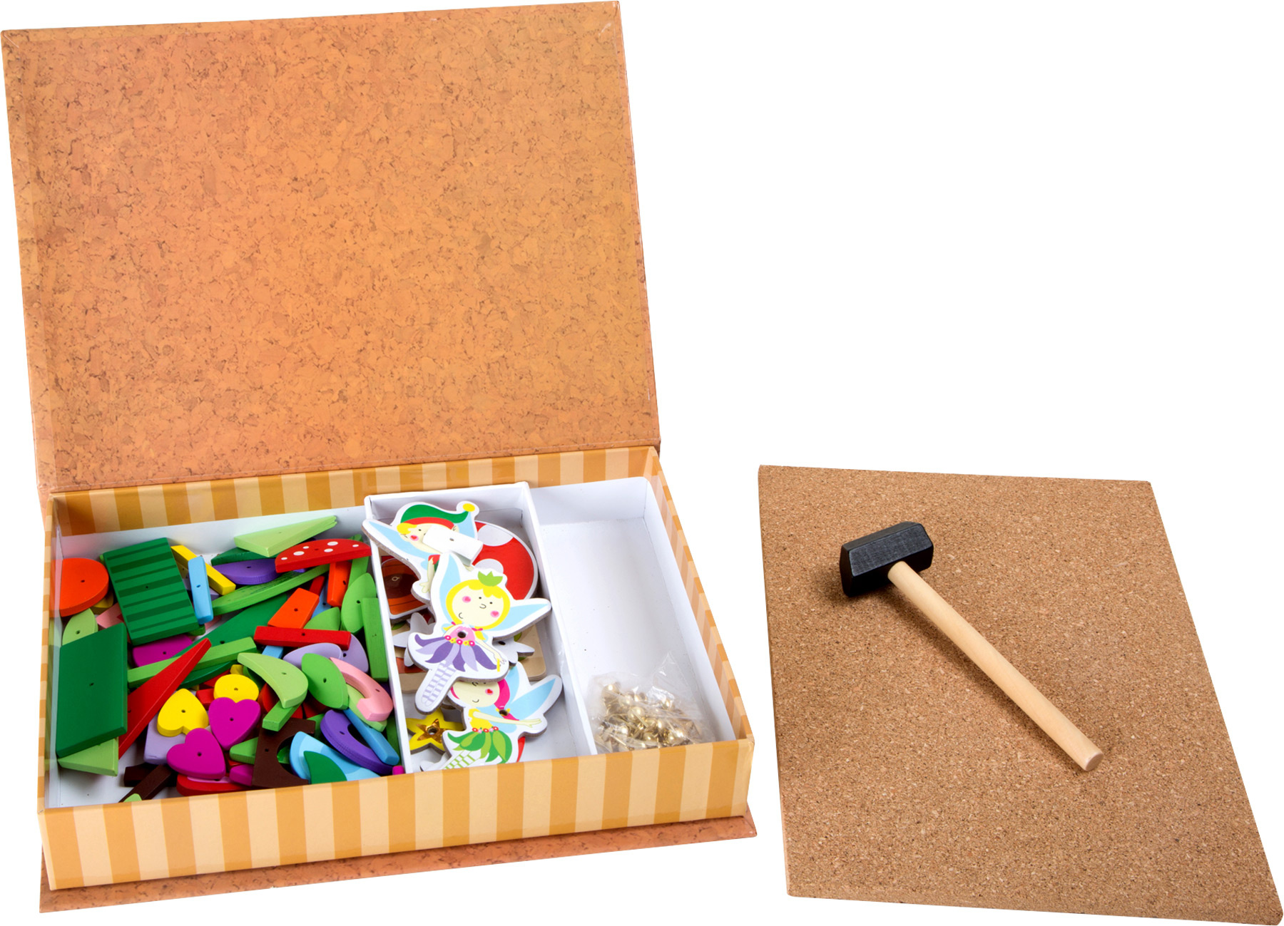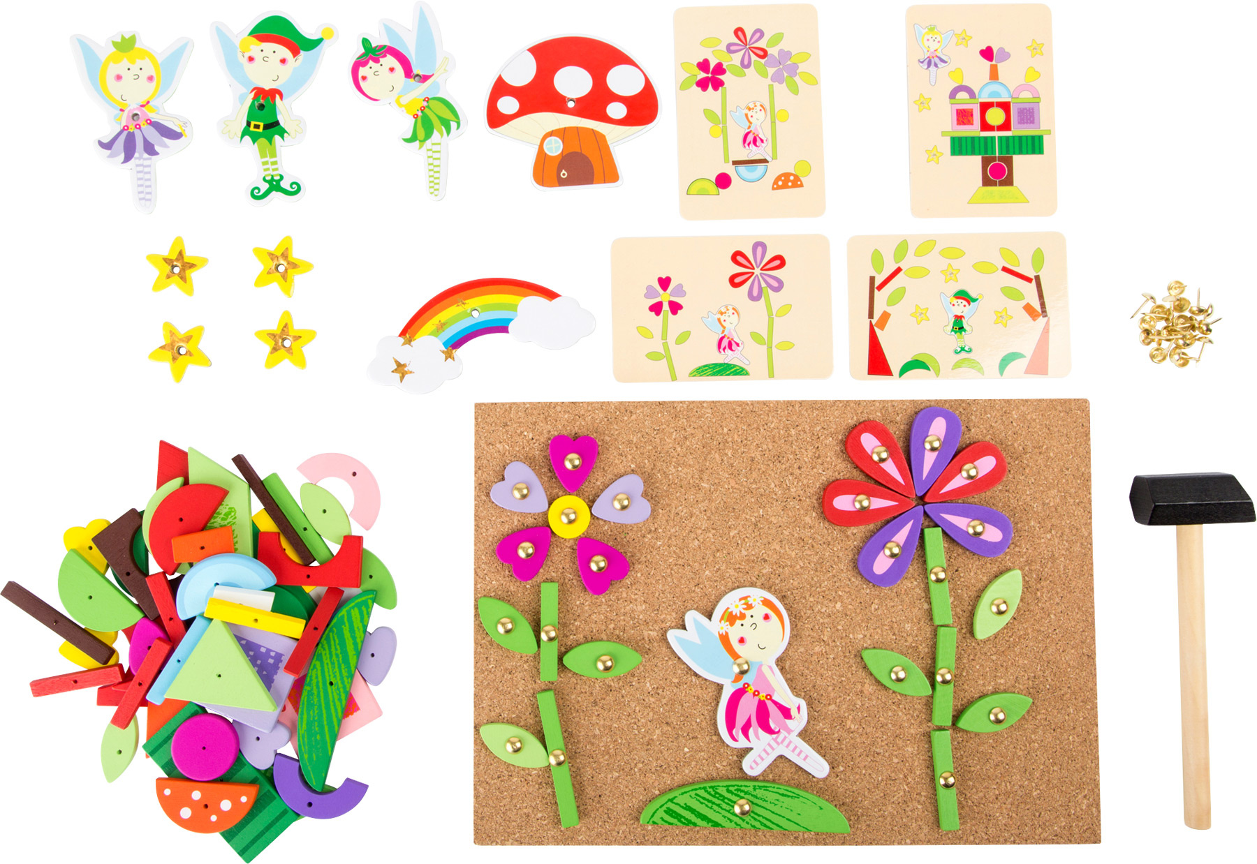S touto hrou si může každé dítě vyrobit svůj vlastní nástěnný obrázek s motivem víl. Dřevěné a kartonové dílky skládačky mají předvrtané otvory, malé hřebíčky lze snadno zatlouct do korkové desky dřevěným kladívkem. Balení obsahuje také čtyři oboustranně potištěné karty s návrhy motivů.