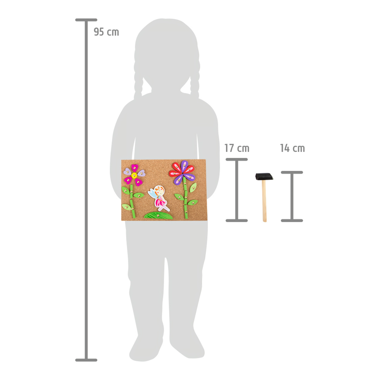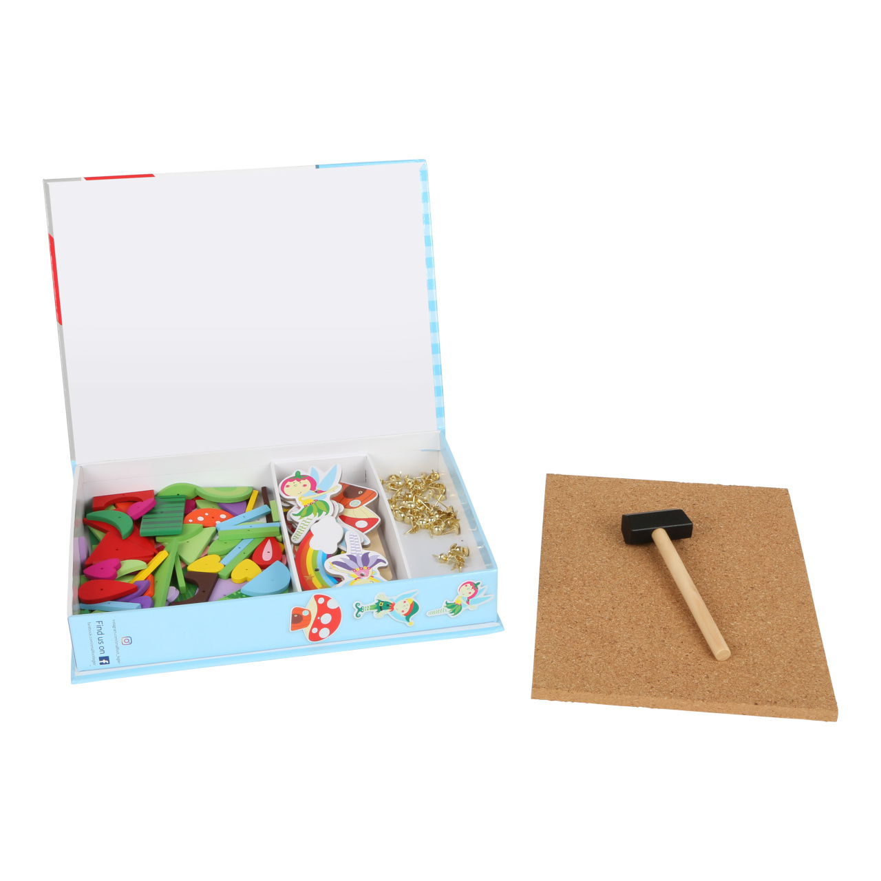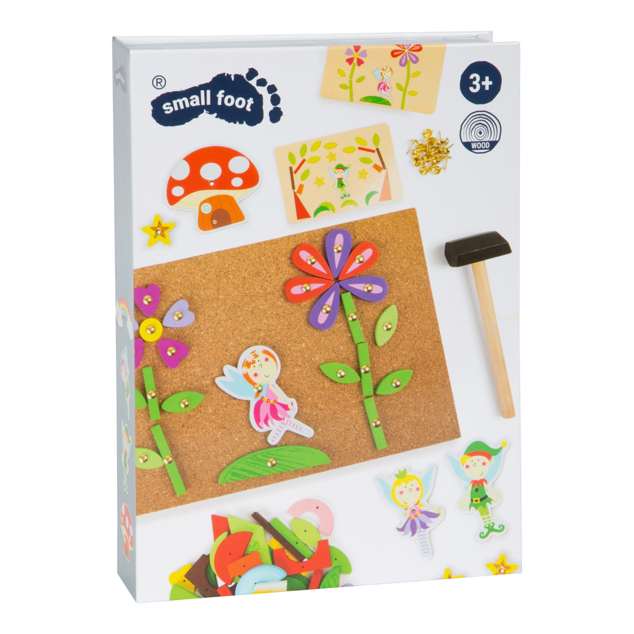 S touto hrou si může každé dítě vyrobit svůj vlastní nástěnný obrázek s motivem víl. Dřevěné a kartonové dílky skládačky mají předvrtané otvory, malé hřebíčky lze snadno zatlouct do korkové desky dřevěným kladívkem. Balení obsahuje také čtyři oboustranně potištěné karty s návrhy motivů.