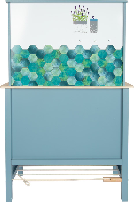 Moderní dětská kuchyňka s robustní konstrukcí v trendy kouřově modré barvě, v kombinaci se stylovými koženými madly v koňakové barvě. Okamžitě připravena k hraní s přiloženým hrncem s poklicí, pánví a kovovým kuchyňským náčiním. Dodává se s kovovým dřezem a otočnými knoflíky, které vydávají zvuk. Součástí je elektronická varná deska se světlem/zvukem a zatahovací digestoří se světelným symbolem. 2v1, vyjímatelný pekáč lze použít také jako tabuli. Povrchy v chladničce a troubě jsou potištěné kuchyňskými detaily pro větší zábavu při hraní. Oboustranný zadní panel s vysoce kvalitním potiskem ve vzhledu dlaždic nebo jednoduché modré barvě. Lze perfektně doplnit dalšími výrobky a kuchyňskými spotřebiči z kolekce Tasty.