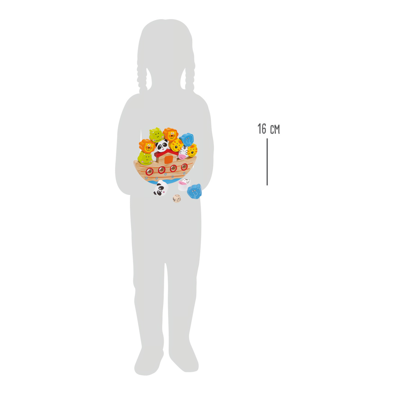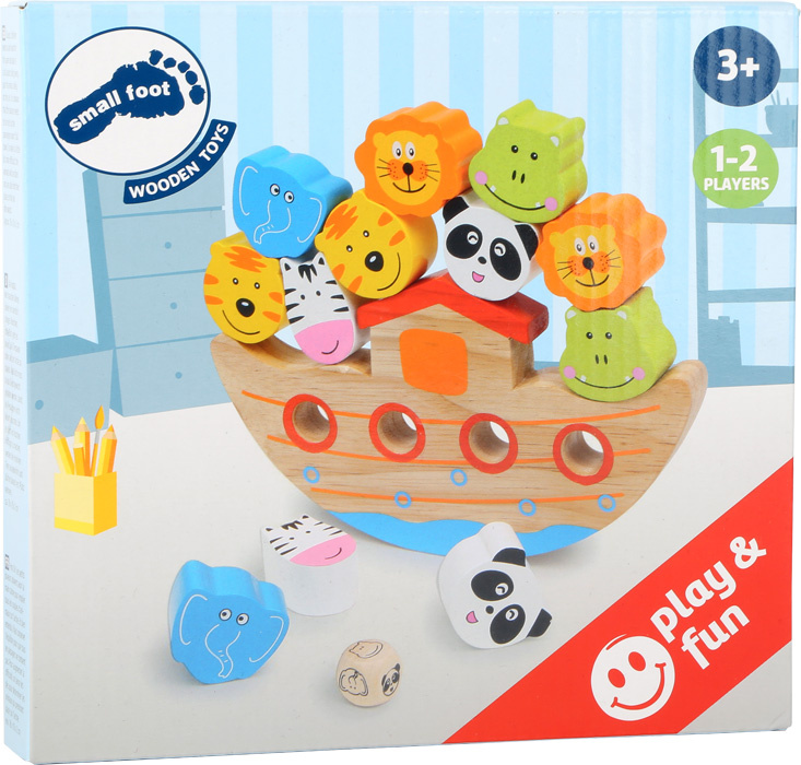 Při této hře musí být na sebe zvířata stavěna tak, aby archa nebyla vyvedena z rovnováhy a pasažéři nespadli dolů. Krásná hra na zkoušku šikovnosti z barevně lakovaného dřeva, pro trénink jemné motoriky a trpělivosti. Malá kostka určuje symboly, které zvířátko má být postaveno na archu. Lze však hrát i bez kostky, aby se tak snížila obtížnost hry.