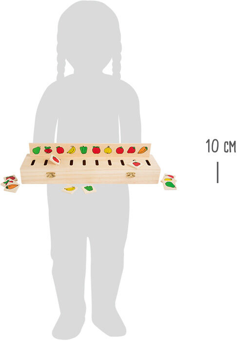 Tato pěkná krabička má 5 zásuvných desek a 50 čtverečků se symboly. Je to dřevěná vkládací hra, která trénuje rozeznávání barev a různých předmětů – oblečení, zvířata, ovoce. Najdete zde ale také geometrické tvary a číslice. Čtvercový dílek s motivem spárujte a poté vhoďte do správného otvoru. Všechny dílky mohou být uloženy do vkládačky, víko je bezpečně uzavíratelné pomocí 2 západek.