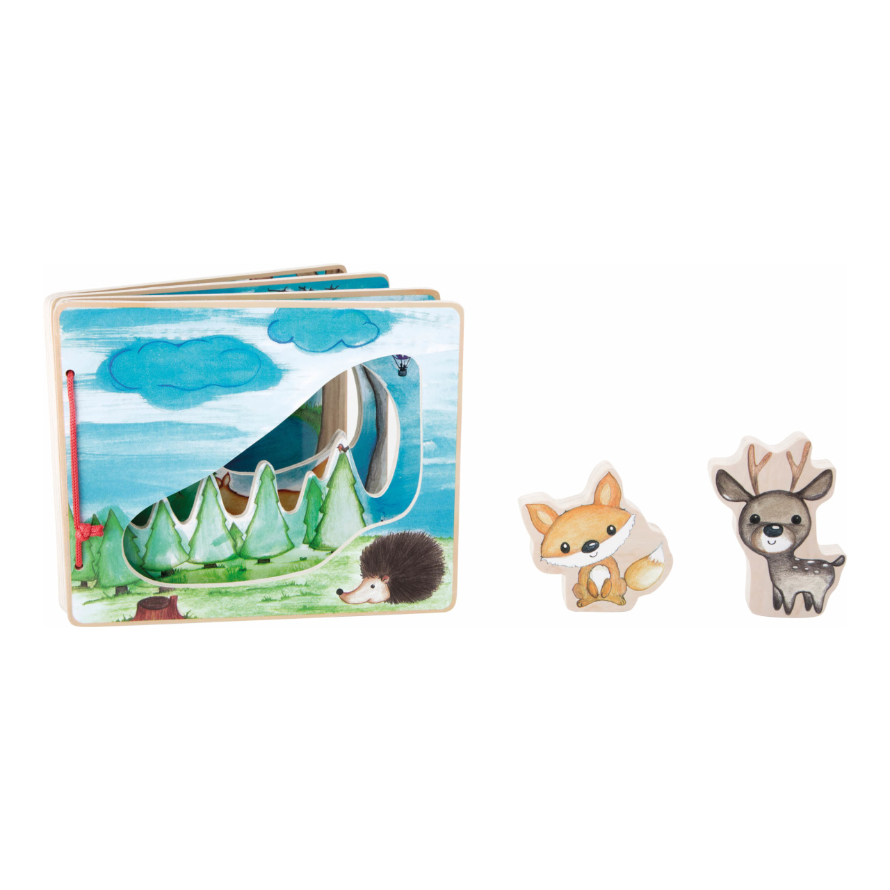 S obrázkovou knihou se ponoříte do hlubokého lesa. Malé průzkumníky budou na výpravě knihou doprovázet liška a jelen, pomohou hravě objevovat flóru i faunu. Kniha podněcuje fantazii a umožňuje prožít dobrodružství. Dvojici lesních zvířecích průvodců lze pro bezpečnou přepravu připevnit na zadní stranu knihy pomocí suchých zipů. Vyrobeno ze 100% certifikovaného dřeva FSC®.
