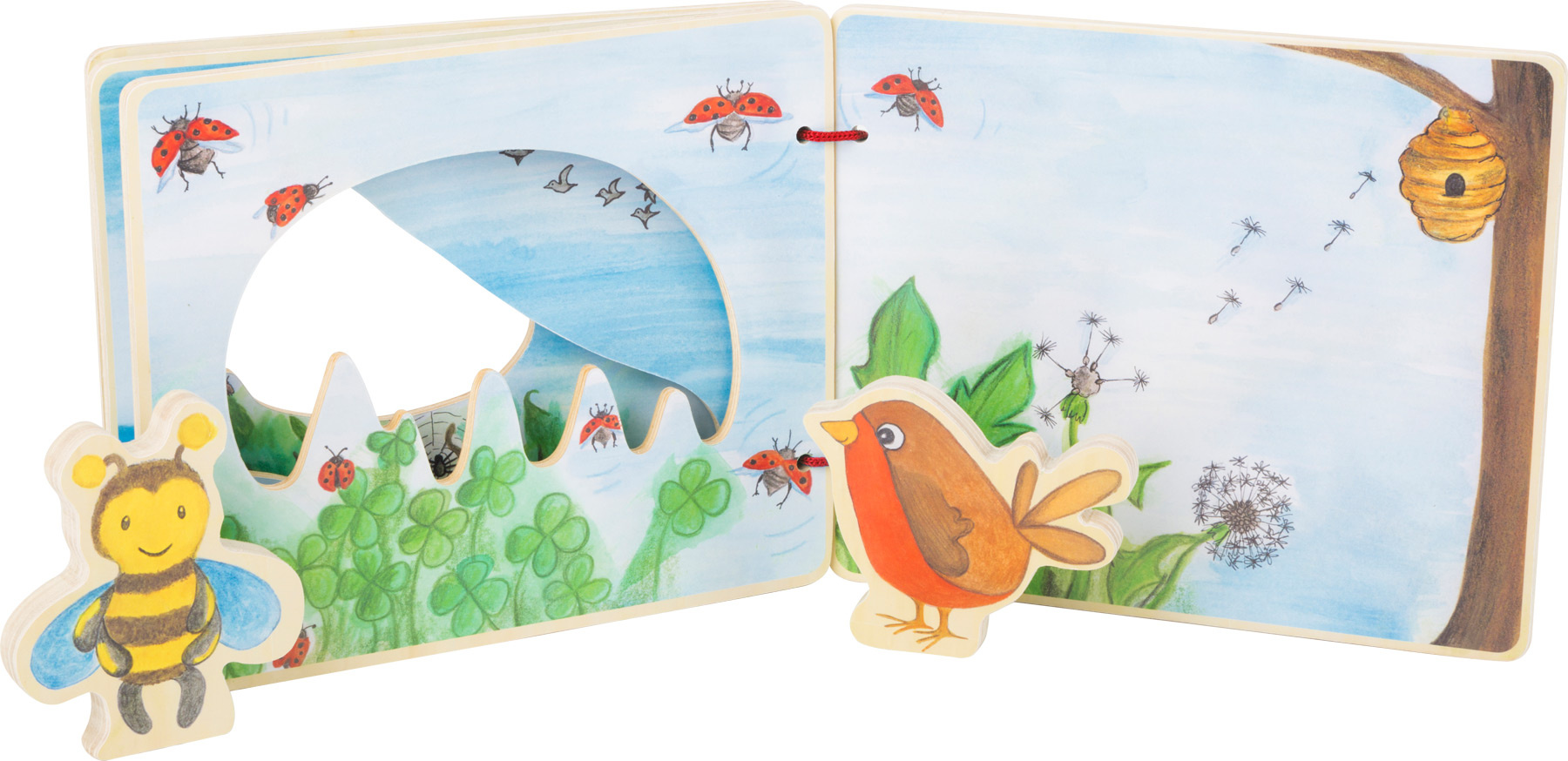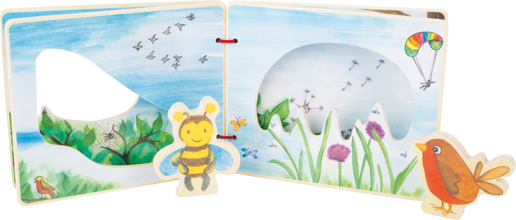 S obrázkovou knihou se vznesete do vzdušných výšin. Malé průzkumníky budou na výpravě knihou doprovázet včelka a ptáček, pomohou hravě objevovat flóru i faunu. Kniha podněcuje fantazii a umožňuje prožít dobrodružství. Dvojici zvířecích průvodců lze pro bezpečnou přepravu připevnit na zadní stranu knihy pomocí suchých zipů. Vyrobeno ze 100% certifikovaného dřeva FSC®.
