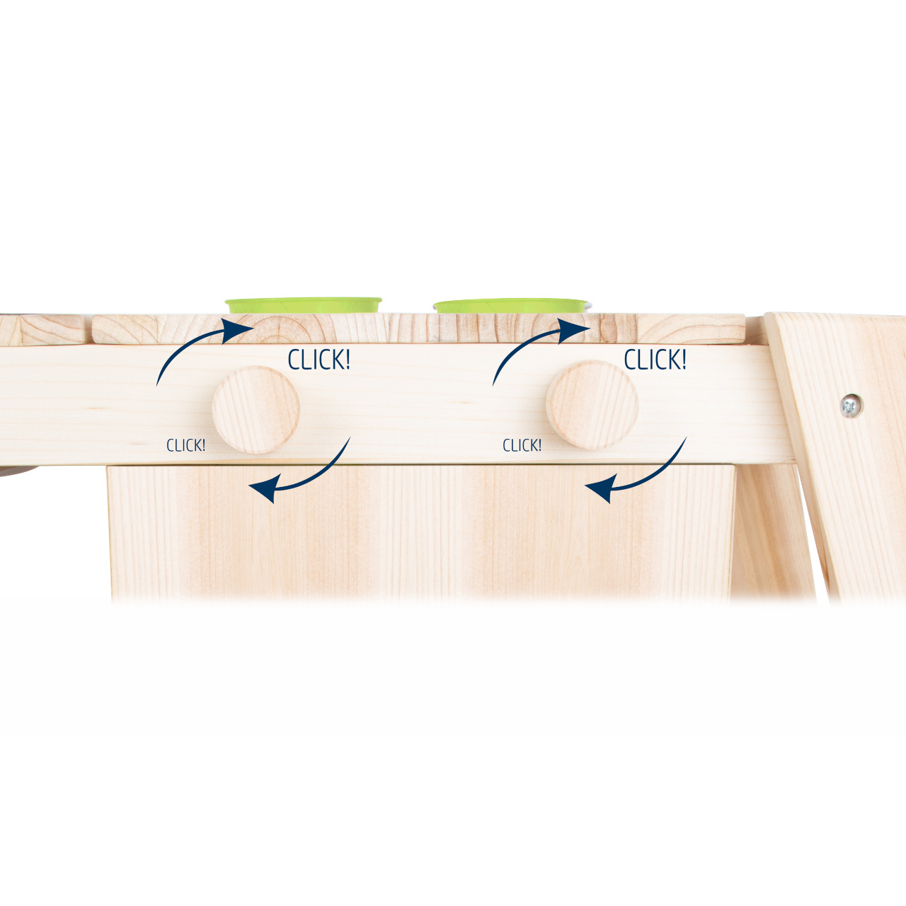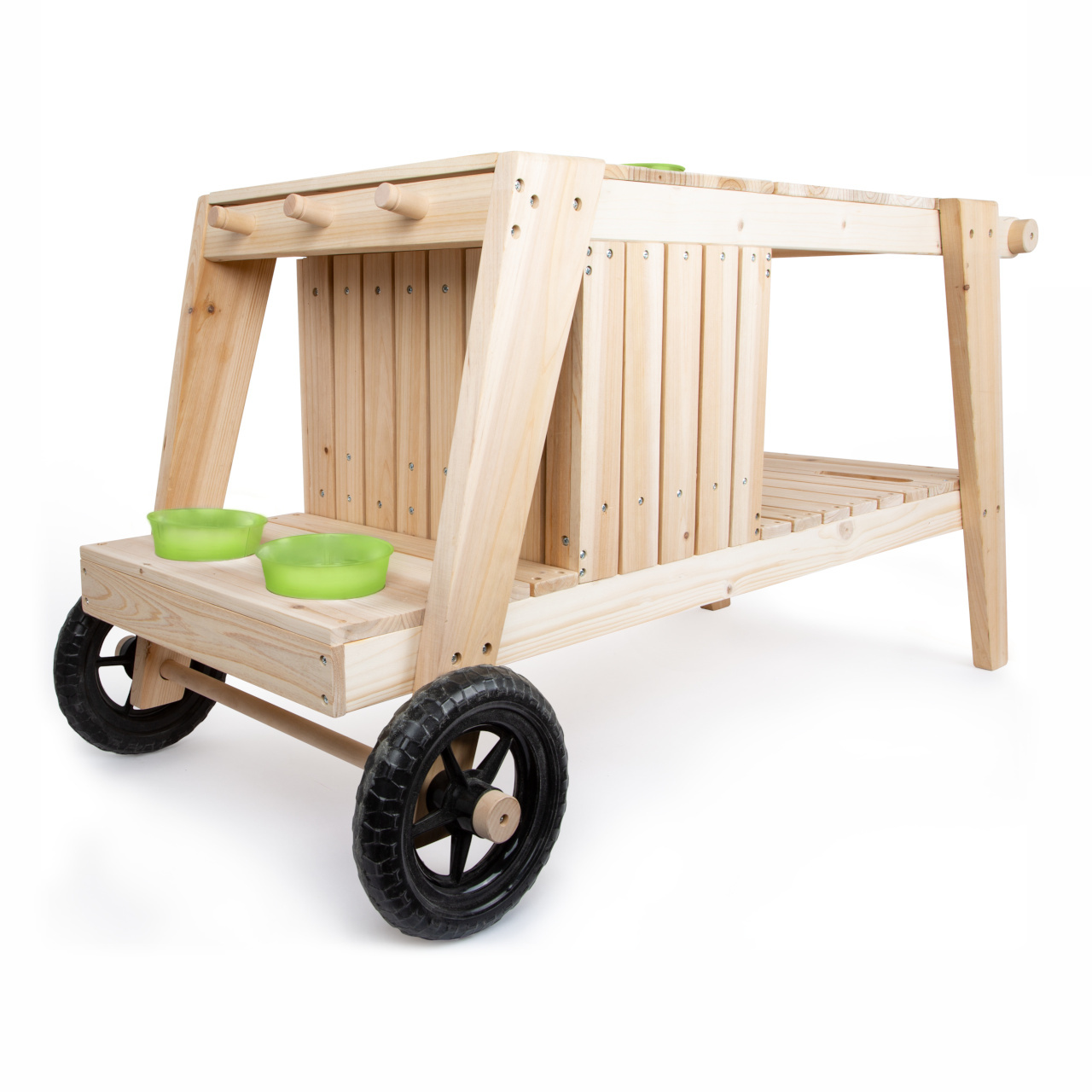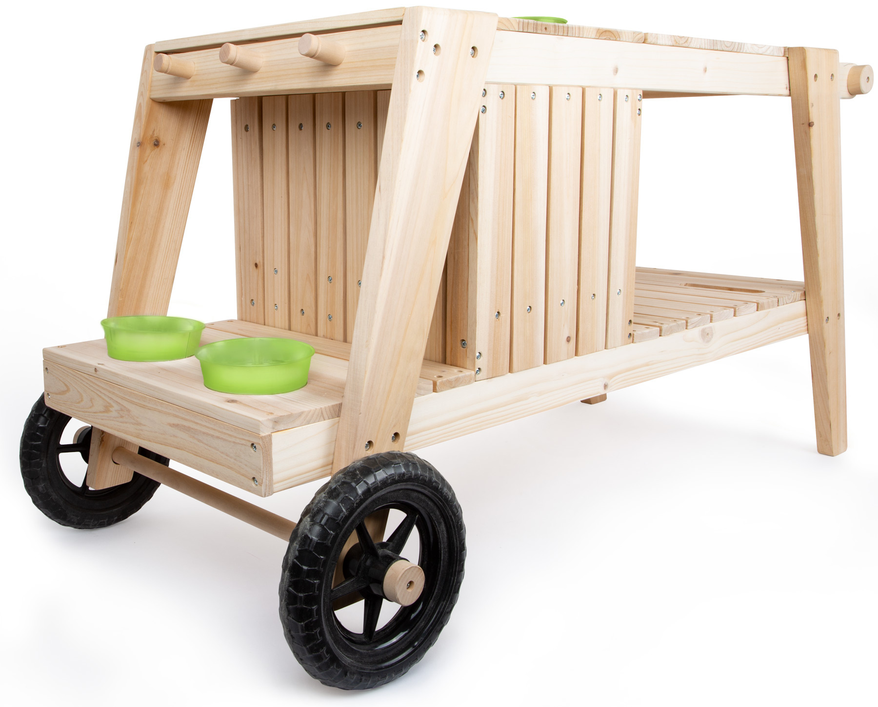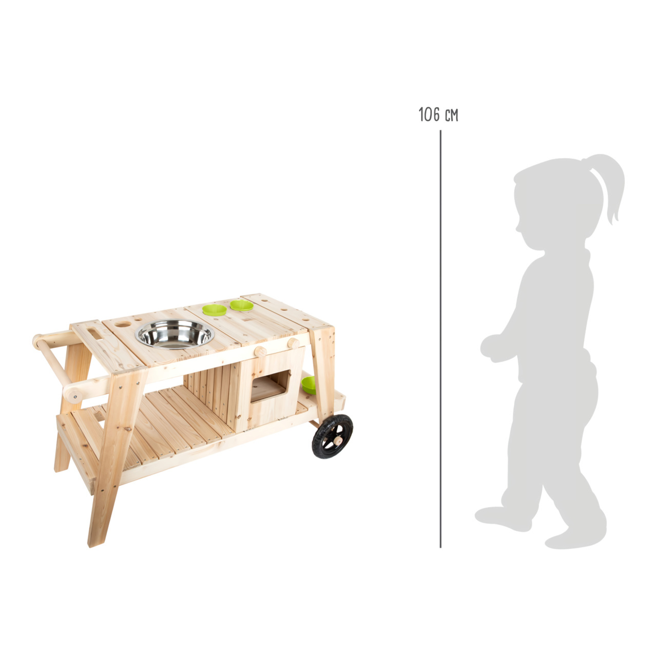 Kdo chce raději vařit venku, na sluníčku a čerstvém vzduchu? Tomu příjde vhod kuchyňka, která svou barevností zapadne do přírody. Je opatřená velkými kolečky a s pomocí dospělého ji lze přemisťovat i v nerovném terénu. Nabízí pevnou a odolnou konstrukci z neošetřeného přírodního dřeva, které pobízí, abyste si ji hravě nalakovali dle vlastní fantazie. Její prostorná pracovní plocha je přístupná ze všech stran a lze ji snadno využít k mnoha různým činnostem. Kuchyňka nabízí troubu opatřenou dvířky s magnetickým zavíráním a dvojicí knoflíků, které otáčením vydávají cvakavé zvuky, pečení jako opravdové! Uvnitř trouby naleznete praktickou dřevěnou desku, kterou lze využít dle potřeb, nejen jako pečící plech. Objemné úložné prostory mohou sloužit k uskladnění kuchyňského, ale i zahradního nářadí. K tomu je kuchyňka vybavena množstvím odkládacích otvorů a závěsů pro další, nejrůznější náčiní. Součástí kuchyňky je větší mísa, menší misky a květináče, vše vyrobené z odolného kovu. Vyrazíte k záhonu, pískovišti, nebo připravit svačinu u bazénu? Výrobek vyžaduje montáž, dodáváno s obrázkovým návodem k sestavení.