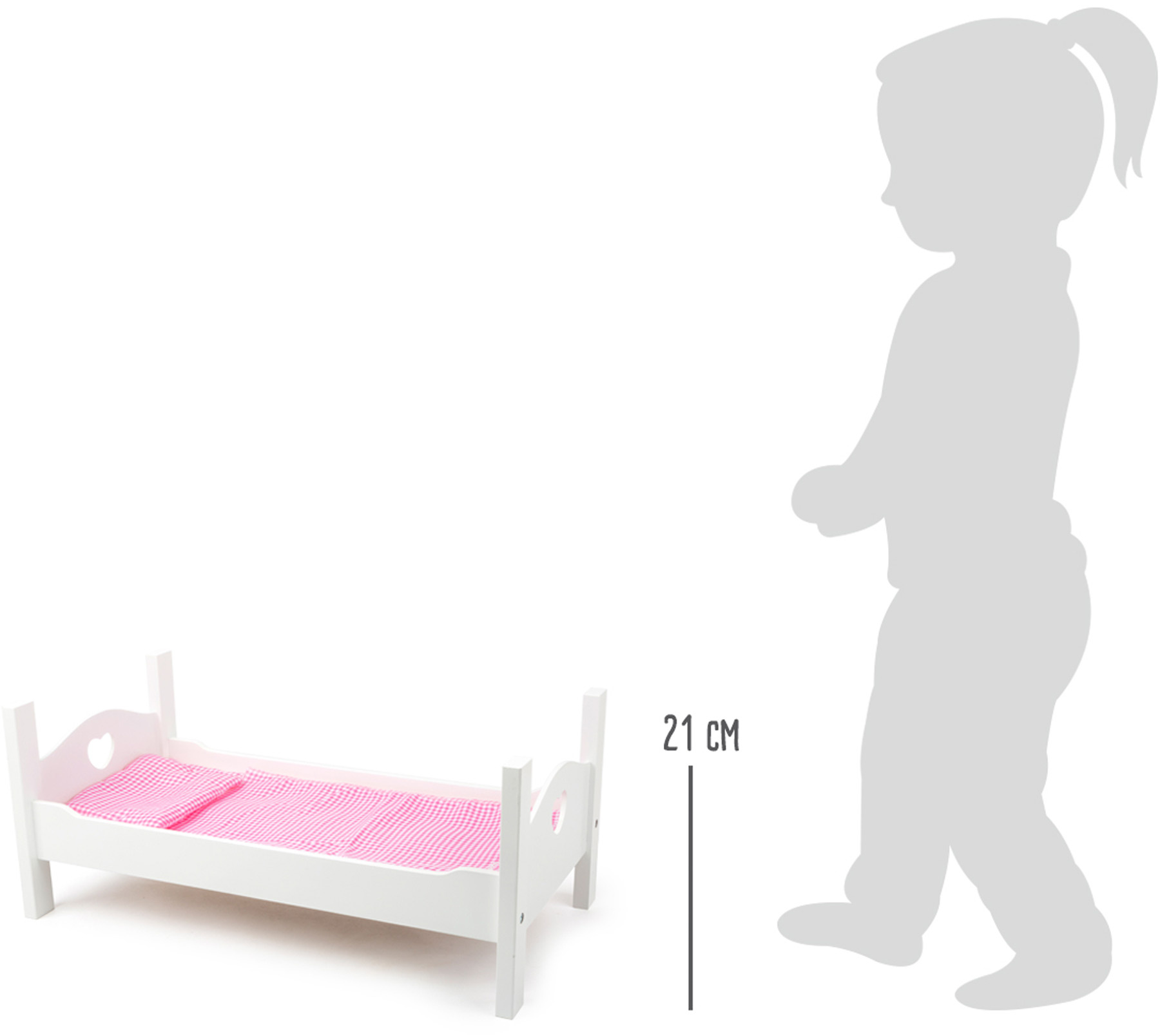 V téhle postýlce se panence či plyšákovi bude spát sladce! Moderní dřevěná postýlka v bílé barvě s detaily srdíček v čelech. Součástí balení je polštář, deka a prostěradlo. Ideální doplněk k sadě nábytku pro panenky.