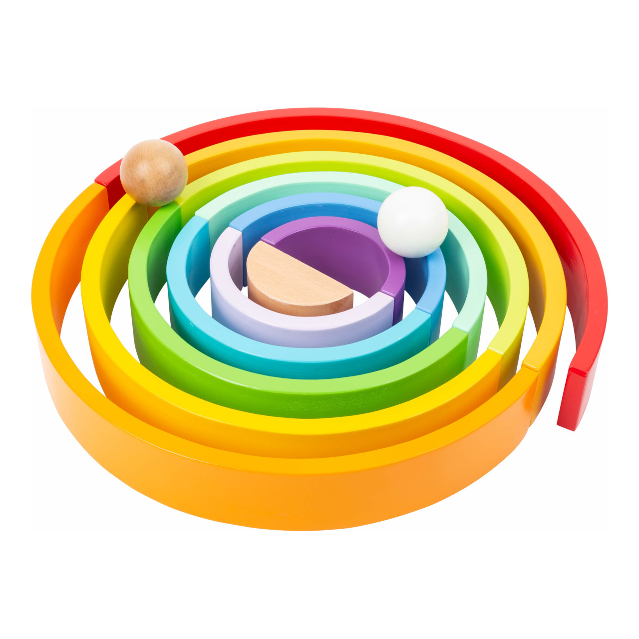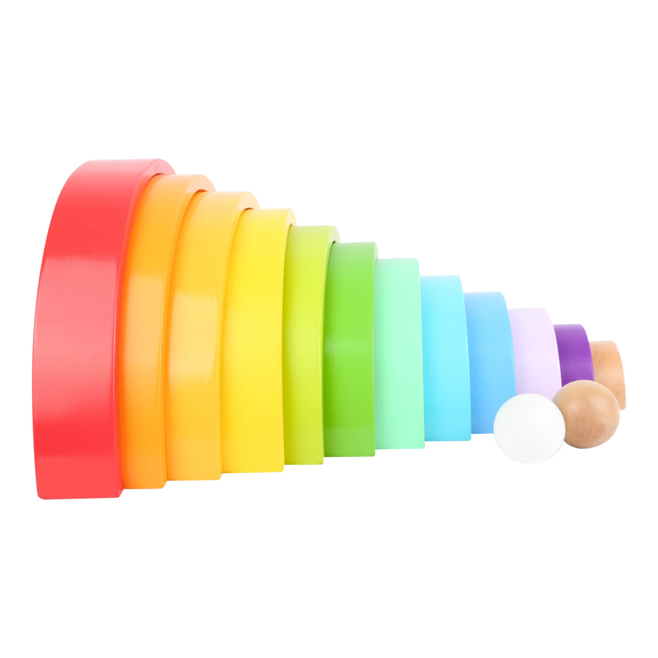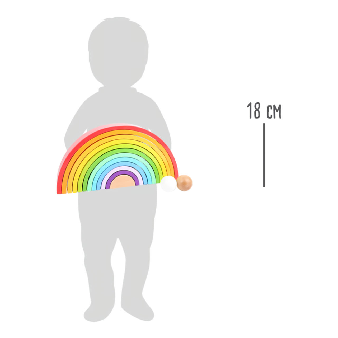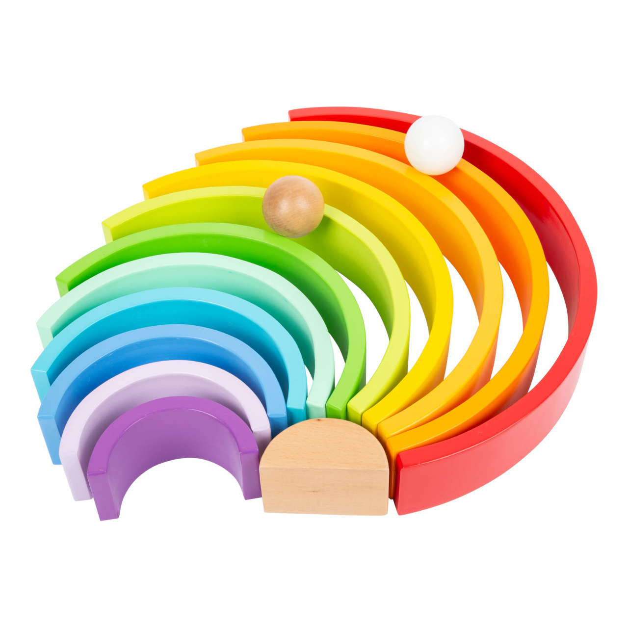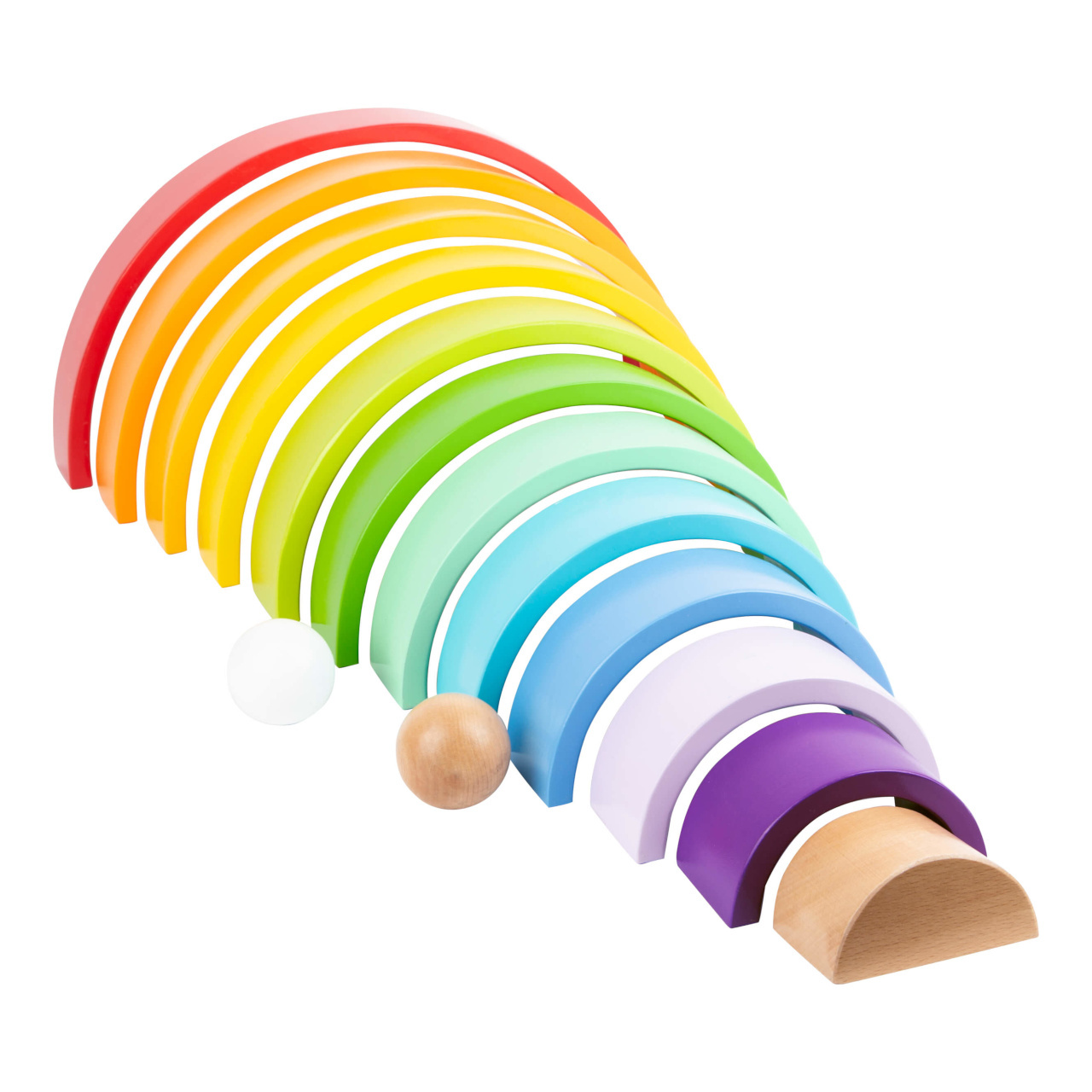 Barevná zábava zaručena! Duha včetně 2 dřevěných kuliček je vyrobena z odolného dřeva v pestrých barvách. Složená duha patří na každou polici v pokojíčku, má mnoho variací skládání a hraní. Z duhy lze vytvořit také dráhy pro kuličky, vysoká věž nebo houpačka pro plyšáky. Je všestranná a podporuje tvořivost dětí. Která barva je nejkrásnější?