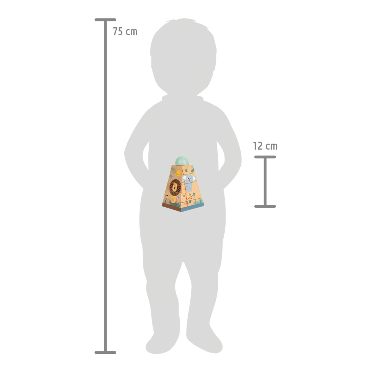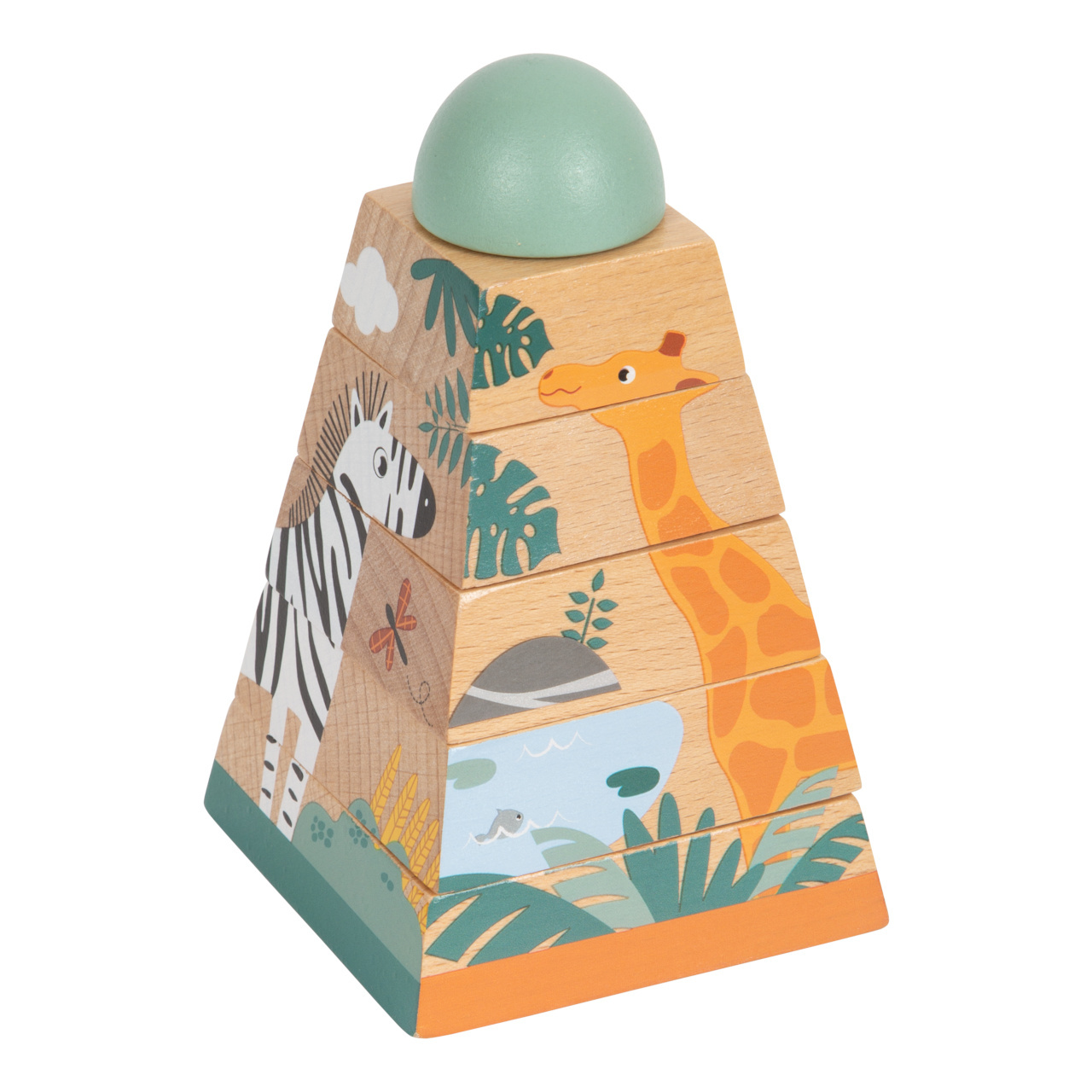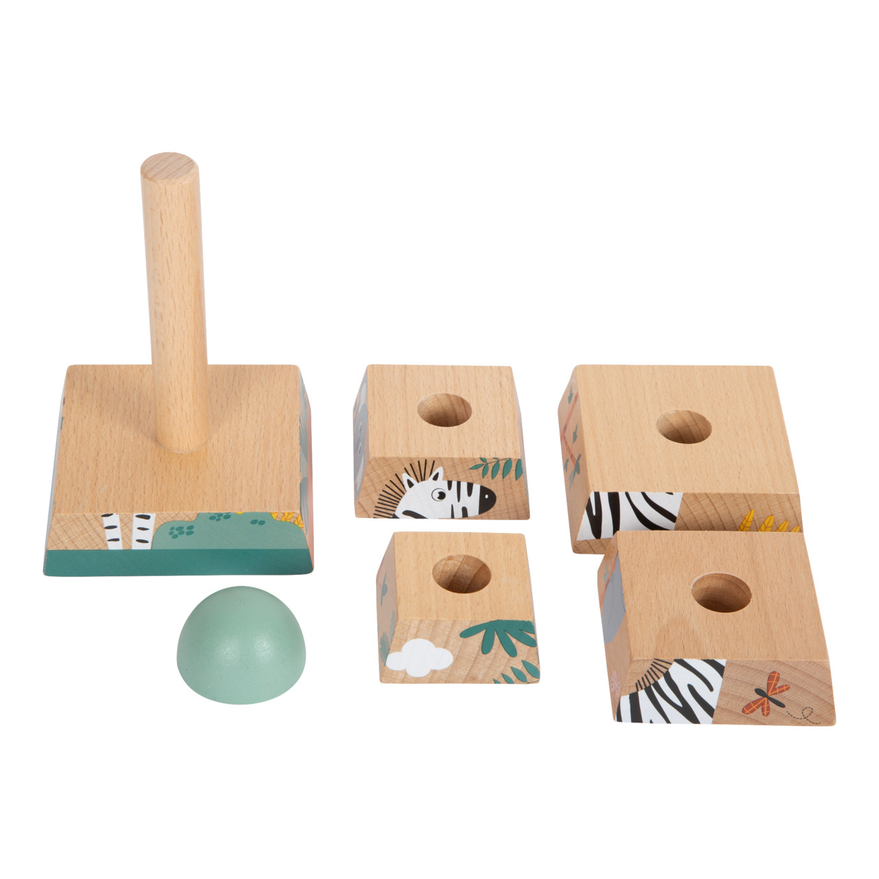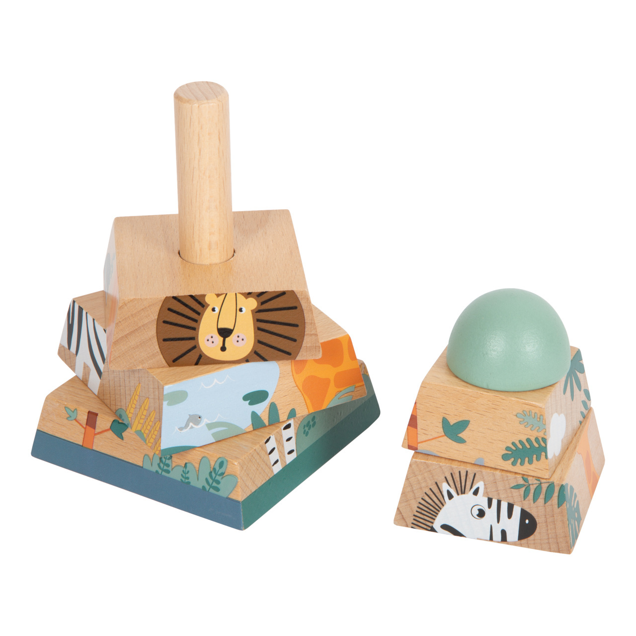 Tato hračka z robustního dřeva je navržena tak, aby rozvíjela jemnou motoriku a prostorové vnímání dětí. Skládáním dřevěných bloků ve správném pořadí vznikne věž, která zobrazuje přátelská divoká zvířata, jako jsou žirafa, zebra a lev, kteří dětem se skládáním pomohou. Sestavení této šestidílné nasazovací věže trénuje koordinaci ruka-oko a odhad velikosti. Je to vzdělávací motorická aktivita a dovednostní hra pro nejmenší děti. Díky své originální barevností vkusně doplní a zútulní dětský pokojíček.