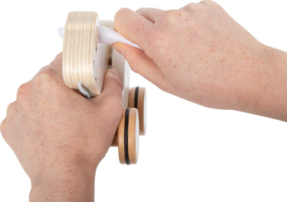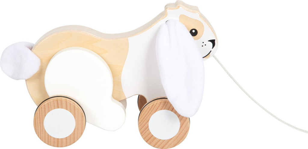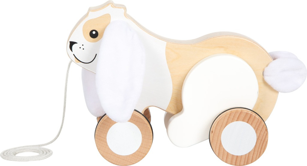 Roztomilý zajíček s měkkými šustivými oušky a ocáskem vyrobený z vysoce kvalitního pevného dřeva se jistě stane nezapomenutelným kamarádem každého dítka při jeho prvních samostatných krůčcích. Dá se snadno táhnout na provázku a povzbuzuje malé děti k lezení a chůzi. Užijí si tak při procházkách spoustu zábavy. Pogumovaná kolečka napomáhají plynulé a tiché jízdě. Hračka podporuje rozvoj motorických dovedností, pohyblivosti a smyslového vnímání. Dlouhá šustivá ouška a ocásek lze snadno odebrat a vyprat.