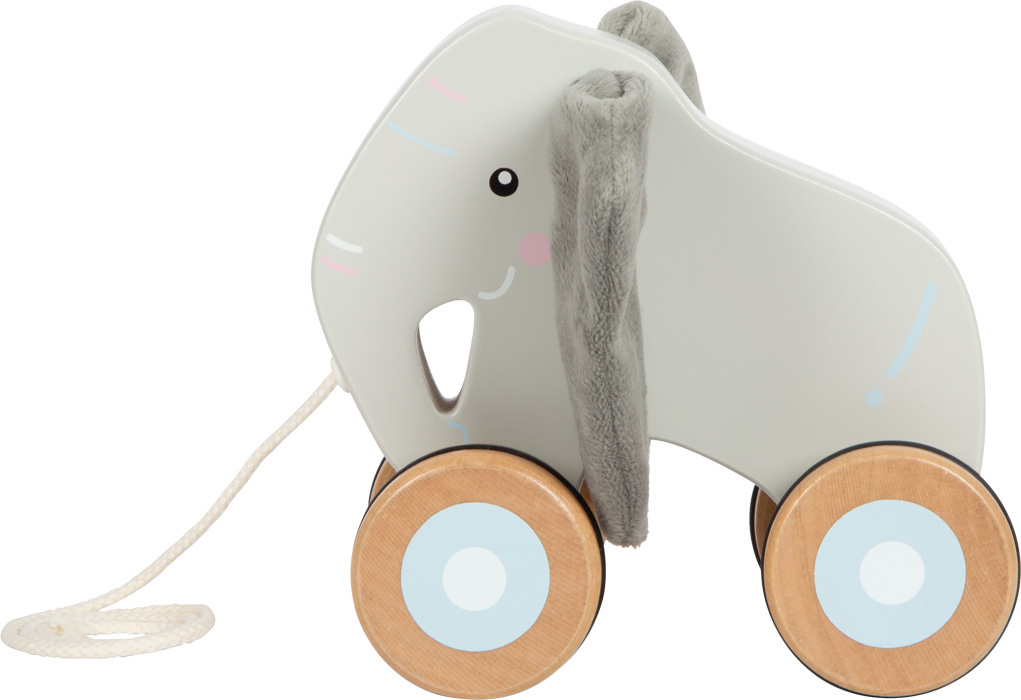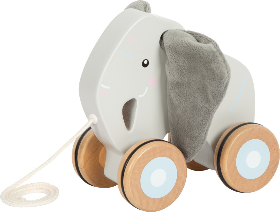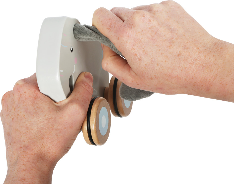 A jedeme! Roztomilý slon na provázku s velkýma, měkkýma ušima vyrobený z vysoce kvalitního pevného dřeva se jistě stane nezapomenutelným kamarádem každého dítka při jeho prvních samostatných krůčcích. Dá se snadno táhnout na provázku a povzbuzuje malé děti k lezení a chůzi. Užijí si tak při procházkách spoustu zábavy. Pogumovaná kolečka napomáhají plynulé a tiché jízdě. Hračka podporuje rozvoj motorických dovedností, pohyblivosti a smyslového vnímání. Šustivá ouška lze snadno odebrat a vyprat.