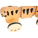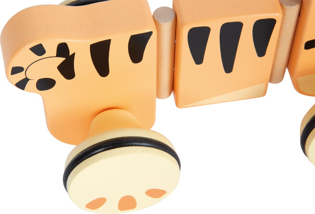 Roztomilý tahací tygřík potěší všechny malé objevitele. Vyrobený ze 100% certifikovaného dřeva FSC®, je nejen ekologický, ale i mimořádně odolný. Díky pogumovaným, tichým kolečkům se hladce pohybuje po podlaze, zatímco flexibilní třídílné tělo se při tažení krásně vlní. Součástí je i tahací provázek, který dětem usnadňuje vedení tygříka a zároveň podporuje jejich samostatnost při chůzi. Jeho přátelský design v safari stylu si děti okamžitě zamilují. Tento veselý společník podporuje rozvoj motoriky, rovnováhy i první krůčky těch nejmenších.