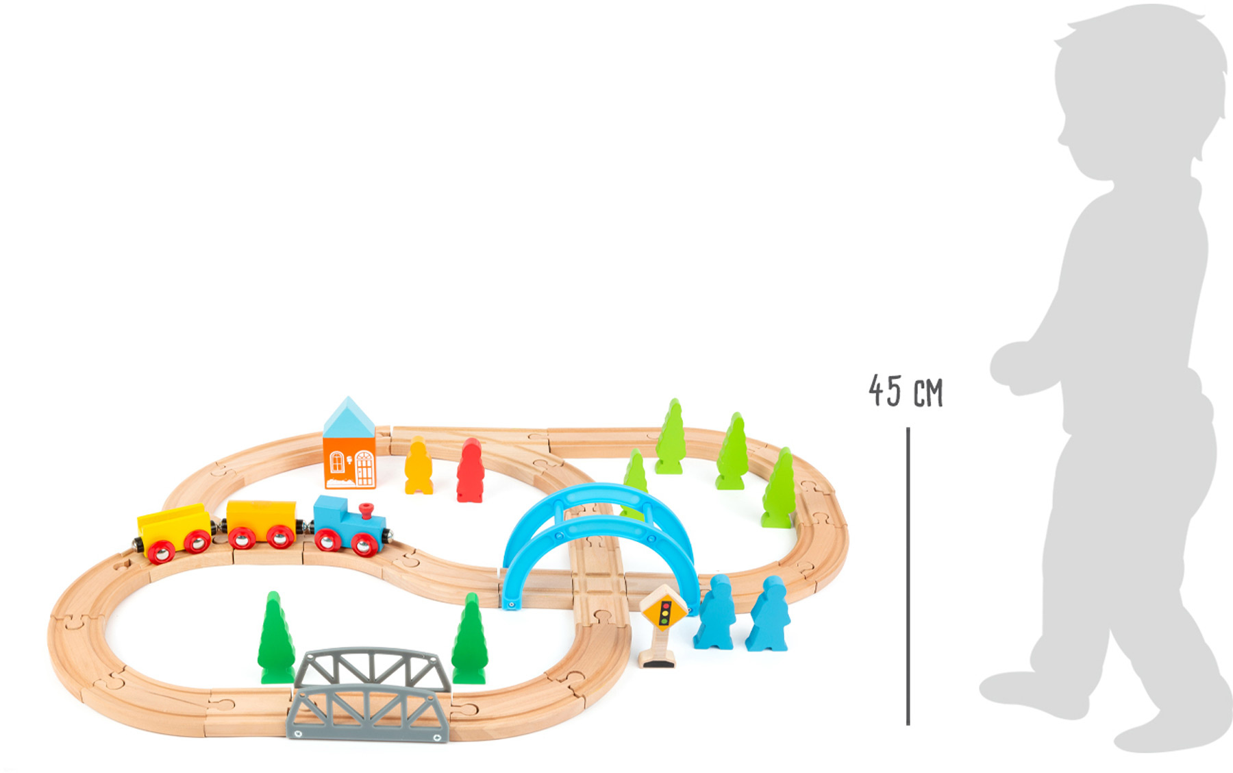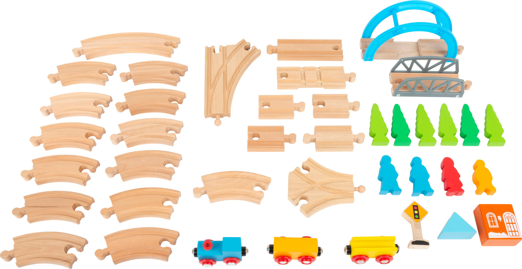 Svět malých železničářů plný zábavy! Vlaková souprava včetně rozsáhlé sady příslušenství vykreslí košatý příběh. Vláček, vagónky, domeček, most, stromy, figurky či semafor budou hlavními postavami této okružní poznávací jízdy. Naložené vagónky lze k vláčku zapojit pomocí magnetu. Produkt je kompatibilní s dřevěnými vláčkodráhami jiných výrobců.