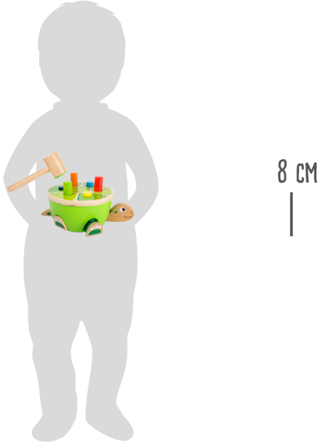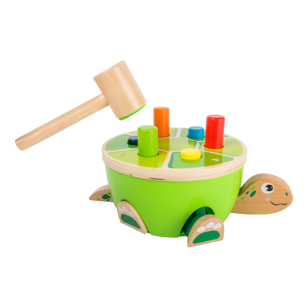 Želvy, dávejte si pozor! Tato originální zatloukačka zábavným způsobem rozvíjí dovednosti a soustředění našich nejmenších. Děti mohou prokázat jak svou obratnost tak svou přesnost. Dřevěné kladivo je opatřeno plstí pro tiché údery. Při úderu na jeden barevný dřevěný kolík se automaticky vysune další. Nohy, hlava a ocas želvy se natahují po úderu z každého kolíčku. Motorická hra, která bude bavit!