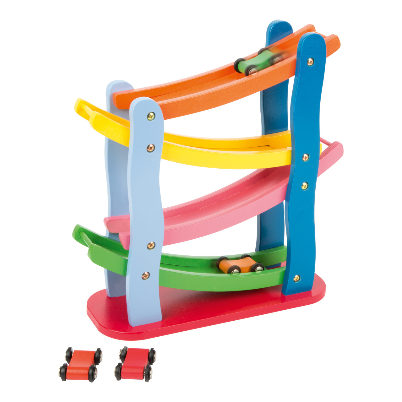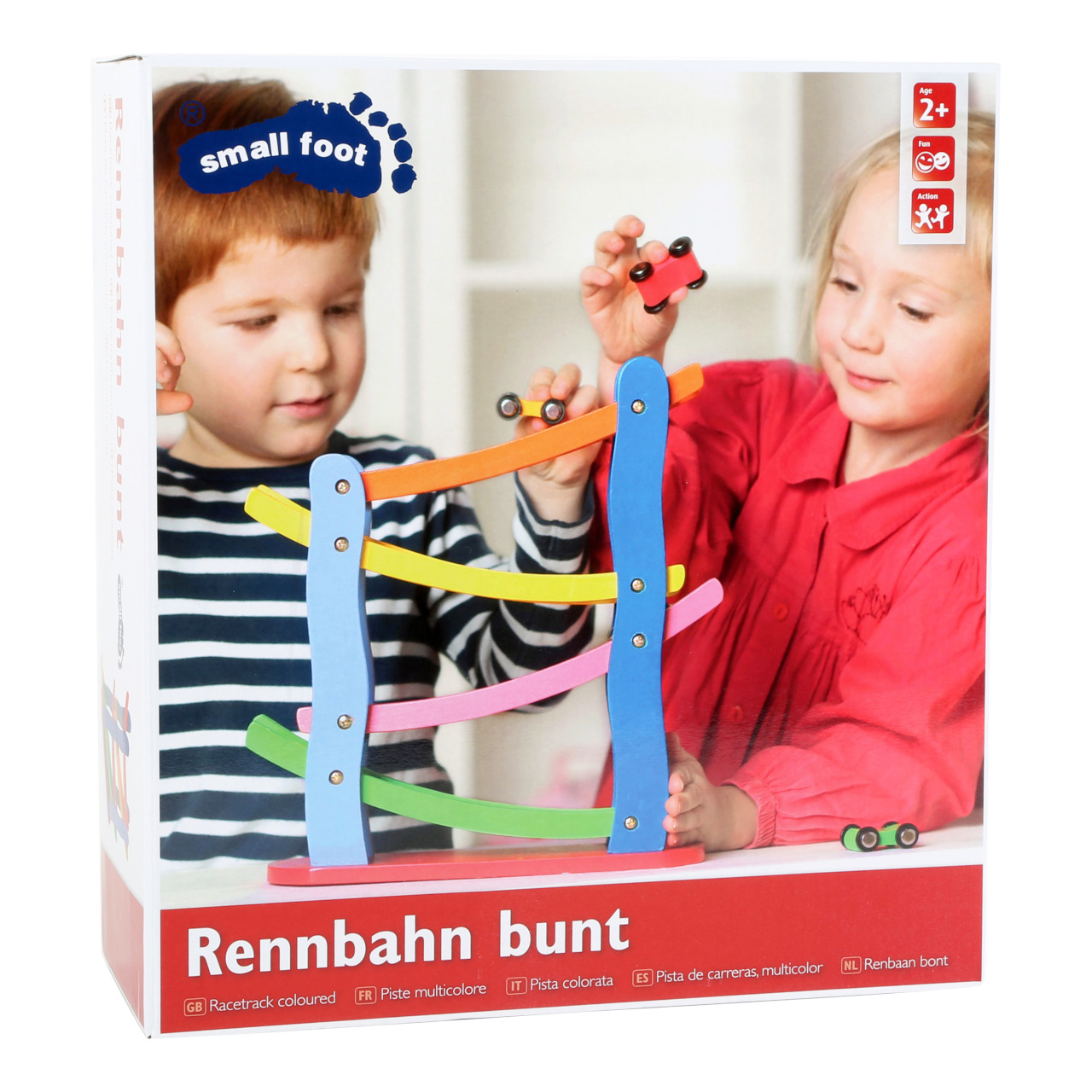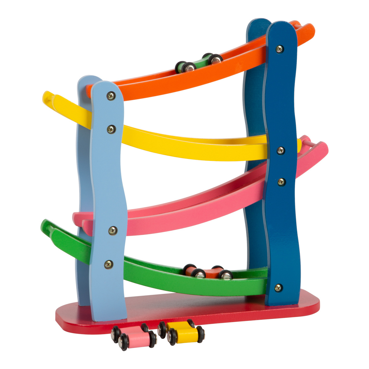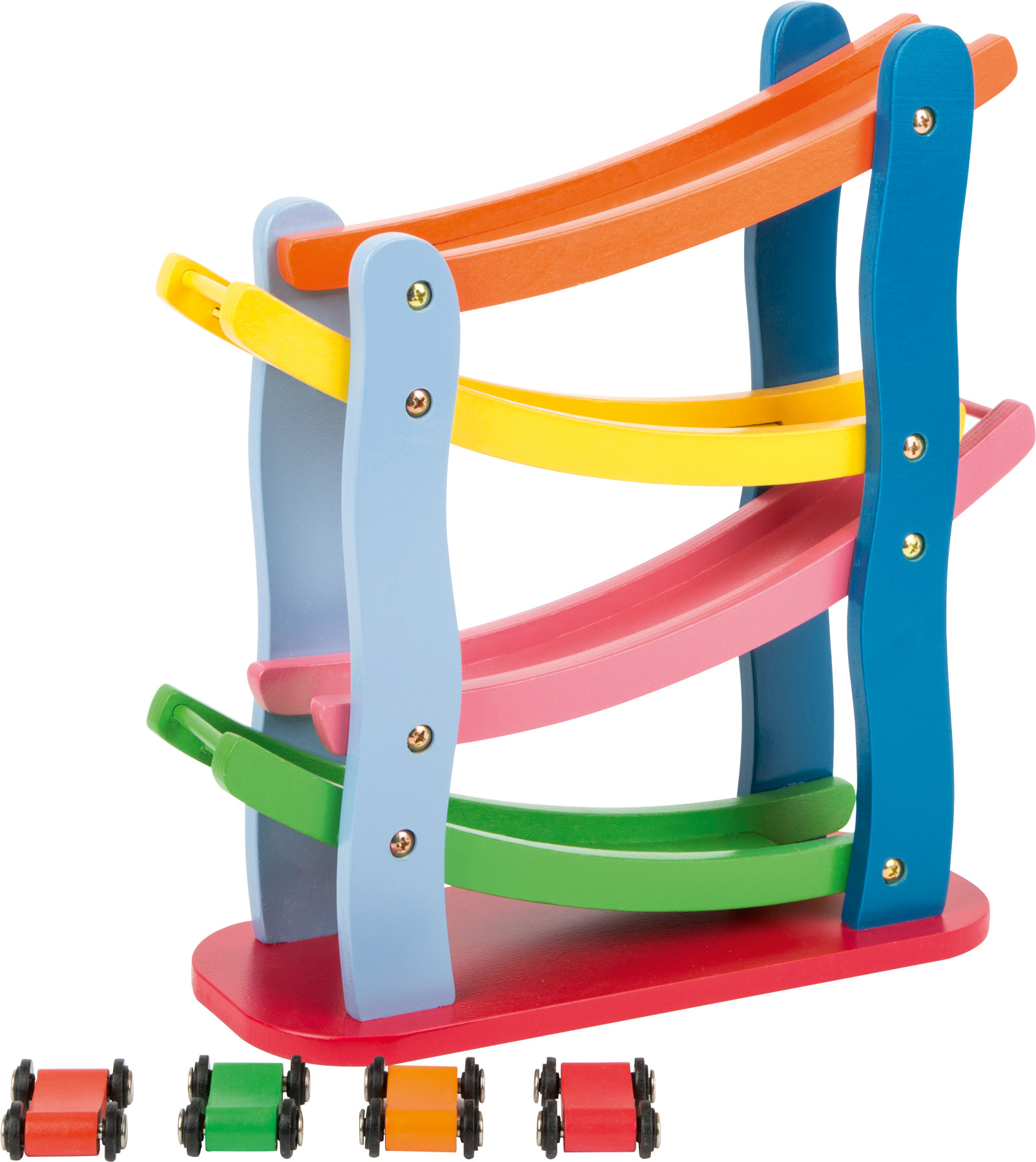 Tato závodní dráha z barevného dřeva je „Formulí 1“ mezi kaskádovými dráhami. Čtyři malá barevná auta uhánějí po stabilní dřevěné závodní dráze a přitom dělají kotrmelce. Dřevěná auta se snadno drží a jsou připravena na další rychlý sjezd.