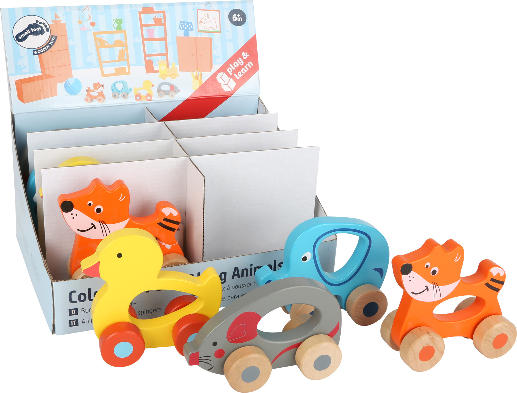Kdo bude tvůj nový přitel? Tato barevná zvířátka na kolečkách se budou zamlouvat každému. Slon, myš, liška i kachnička na kolečkách jsou ze dřeva a krásně malovány. Díky otvoru v těle zvířat je mohou děti jednoduše uchopit, kolečka se nezadrhávají.