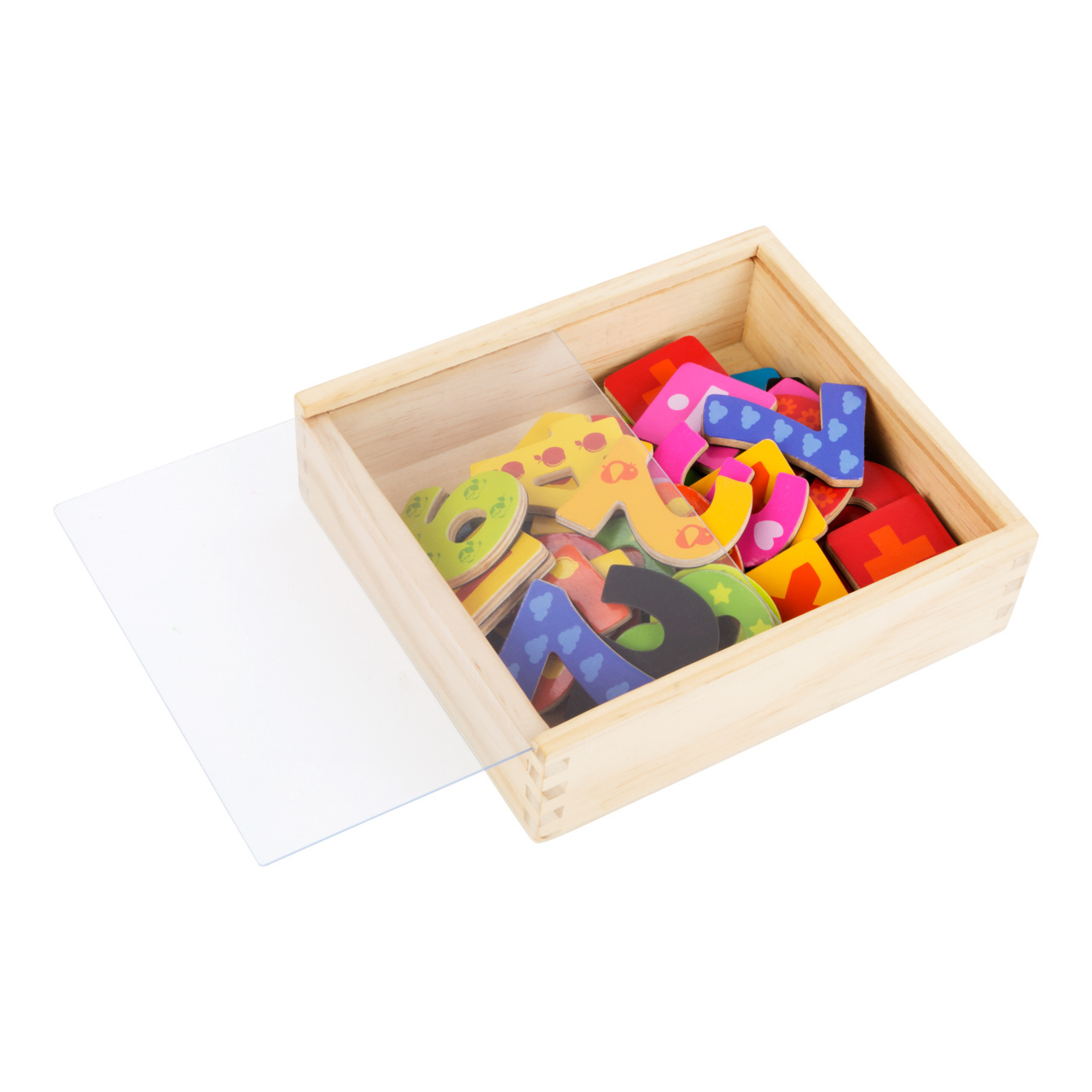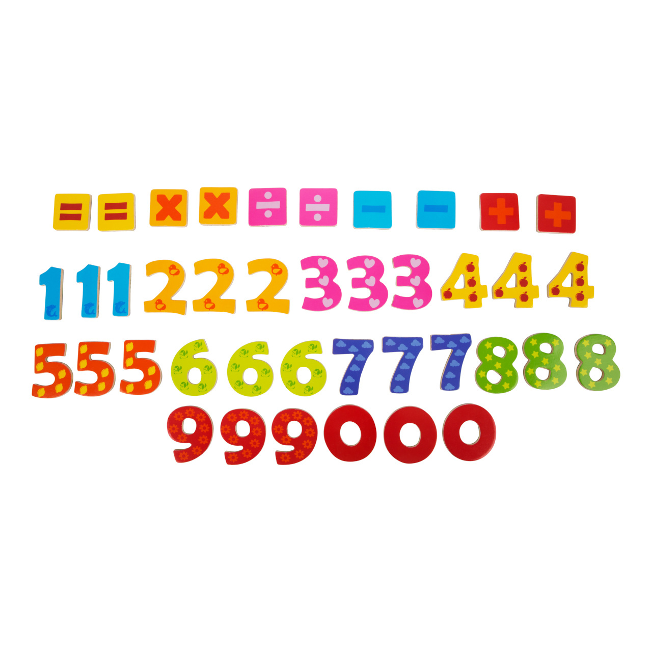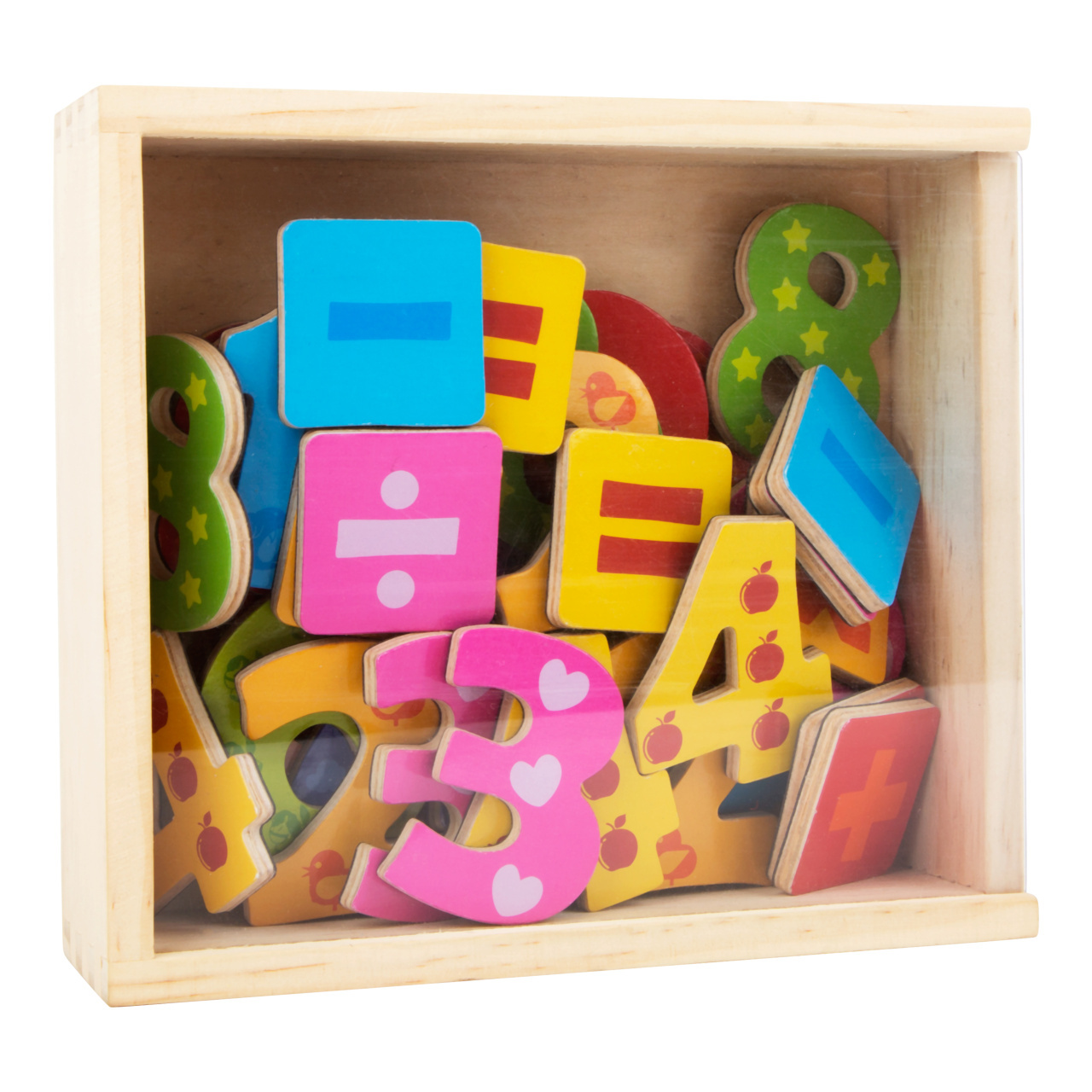 Sada obsahuje 40 barevně malovaných dílků s čísly od 0 do 9 na magnetickém laminovaném dřevě. Tyto dílky lze uložit do dřevěné krabičky s průhledným víkem, kde se zaručeně neztratí. Děti mohou sestavit a vyřešit své první matematické rovnice a rozvíjet tak své logické myšlení. Veselá čísla můžete připevnit na mnohá místa jako např. ledničku, jelikož mají magnetickou funkci.