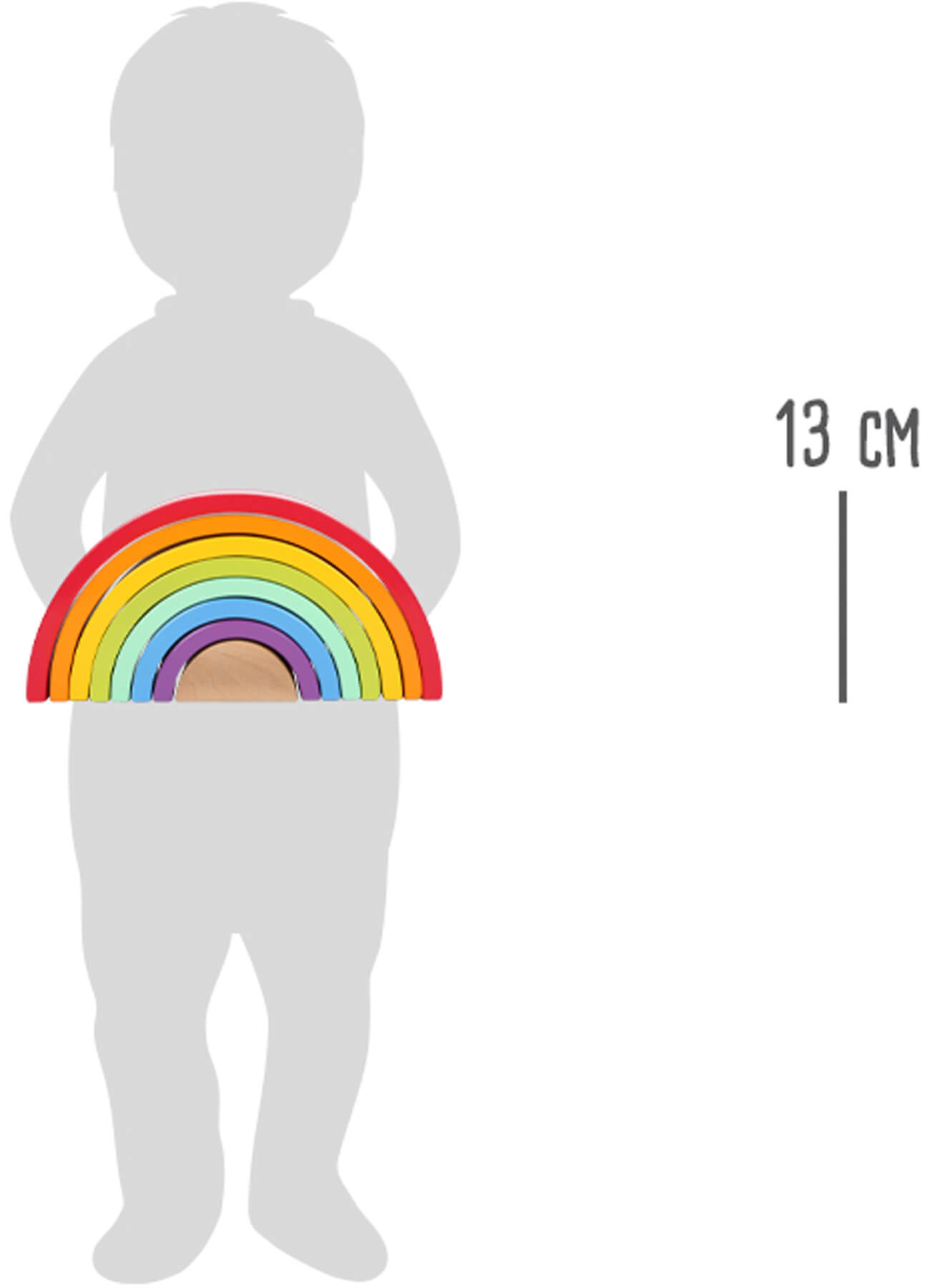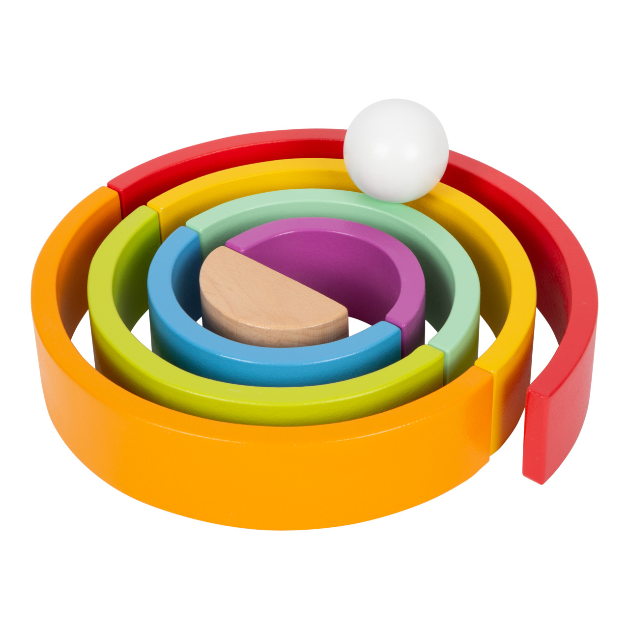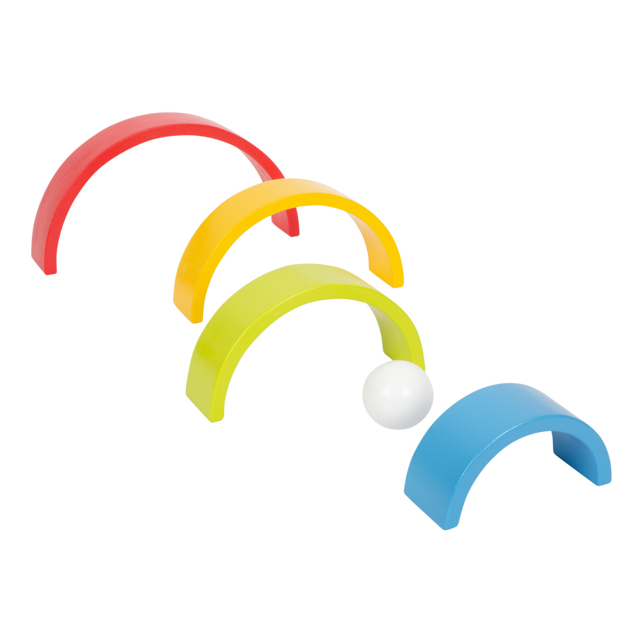 Která barva je nejkrásnější? Tuto robustní dřevěnou duhu doplňuje bílá dřevěná kulička. Archa v barvách duhy je univerzální, můžete ji skládat na sebe, stavět z ní dráhy... Perfektní hračka pro kojence, trénuje motoriku.