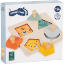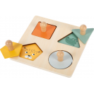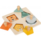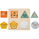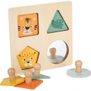 Toto robustní vkládací Montessori puzzle je vyrobeno ze 100% certifikovaného dřeva FSC®. Obsahuje čtyři barevné dílky puzzle v různých geometrických tvarech, které dokonale padnou do dětských ručiček. Pod jednotlivými dílky se skrývají tři zvířecí obličeje – tygr, krokodýl a leopard – a také zrcátko, které přináší zábavný prvek překvapení. Každý dílek má praktický dřevěný kolíček, díky němuž se snadno uchopuje a rozvíjí jemnou motoriku i koordinaci ruka-oko. Skládačka podporuje rozpoznávání barev a tvarů, soustředění, trpělivost a vytrvalost.