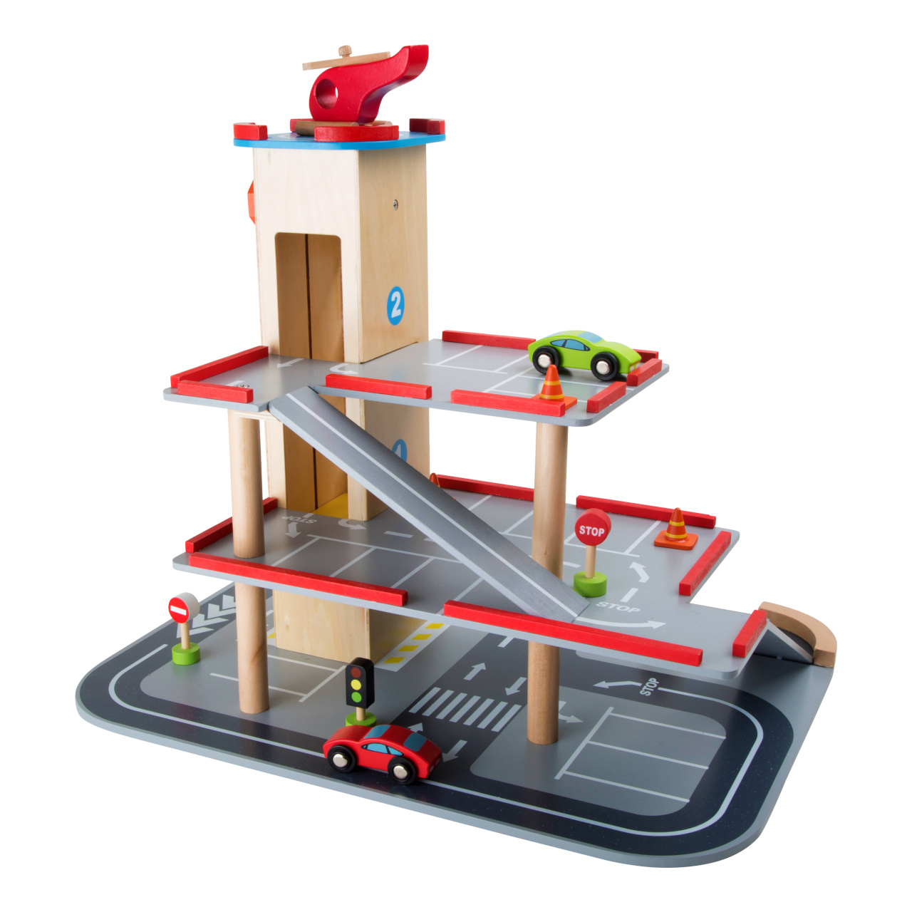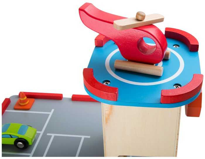 Zábava na třech podlažích! Výtah vyveze auta do požadovaného patra, heliport má dost místa pro hladké přistání helikoptéry, v přízemí mohou auta natankovat. Množství značek pomáhá s řízením dopravy. Součástí jsou 2 auta, vrtulník, 4 dopravní značky a 3 dopravní kužely, benzínová pumpa a závora. Od teď bude v dětském pokoji opravdu velký provoz.