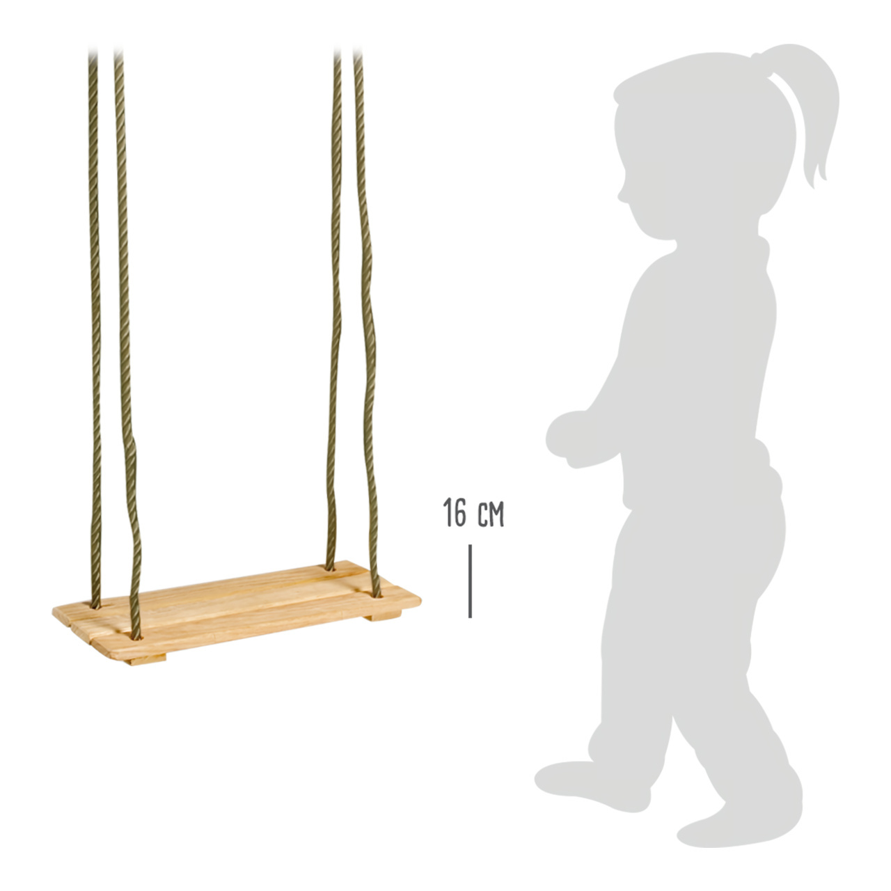 Klasická houpačka v tradičním, nestárnoucím provedení hravě zpestří zahradu, nebo i interiér. Je vyrobena z masivního, pečlivě opracovaného dřeva. Díky přírodní úpravě se děti mohou zabavit jejím individuálním barvením a lakováním. Velmi poddajná a odolná nylonová lana jsou na koncích opatřena kovovými kroužky k zavěšení. Výšku houpačky lze kdykoli snadno upravit pomocí kovových průvlaků, a může se tak stále přizpůsobovat rostoucím dětem.