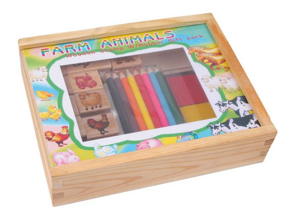 Zvířecí obyvatele farmy se zde pomocí 9 razítek a 2 inkoustovými polštářky octnou na papíře. S 8 pastelkami si mohou děti motivy barevně vymalovat. V dřevěné krabici je dodatečně místo na další potřeby.