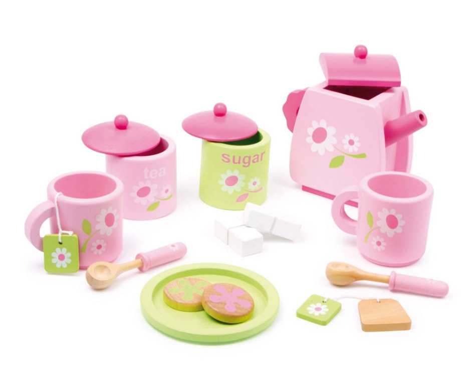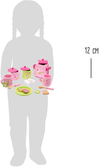 V jemně růžové a pastelově zelené barvě jsou dva šálky s víčkem, konvička, cukřenka a hrnečky na čaj, pastvou pro oči při čajovém dýchánku. Čajový servis s jemnými květinovými motivy doplňují dvě lžičky, dva čajové sáčky, dvě kostky cukru i talíř a dvě sušenky. Konvička, dóza na cukr a čaj mají odnímatelé víko.