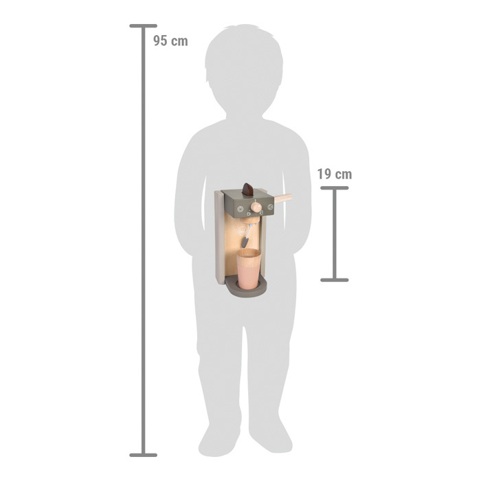 Pro malé baristy a baristky! Tato kompletní dřevěná sada se skládá z dětského kávovaru s 2 kávovými kapslemi, 2 šálky na kávu s sebou a 2 kopečky mléčné pěny. Kávovar nabízí realistickou hru, kávové kapsle zapadnou do přístroje, hotovou kávu můžete nazdobit magnetickou mléčnou pěnou. Kávovar má nenápadné barvy a mnoho viditelného dřeva. Kávové kapsle do kávovaru zapadnou pomocí boční páčky, kuželovitý tvar kelímků zajistí, že kapsle spadne přímo do nich. Magnetický napěňovač vám poskytne mléko do kávy. Napěňovač je vyroben z drátku obaleného v textilu, ohýbá se do všech stran a na konci má magnet, na který můžete připevnit mléčnou pěnu. Tato sada má barevný design kompatibilní s dalšími produkty řady Tasty od small foot, například Dřevěnou kuchyňkou LE12216.