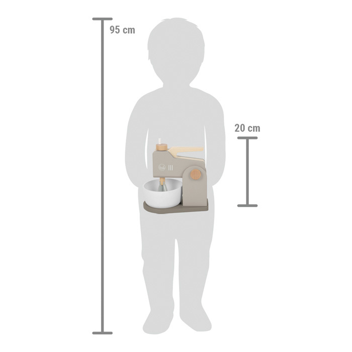 S touto dřevěnou sadou mixéru v teplé šedé barvě s množstvím přírodního dřeva budou malí pekaři i pekařky ve své kuchyňce skvěle vybaveni. 2 v 1! Ruční mixér se dá připevnit k podstavci mixéru a během chvíle se tak promění v moderní kuchyňský robot. Metlička ještě umocňuje realistický herní zážitek, neboť jí lze otáčet pomocí rukojetí. Samozřejmě nechybí ani dřevěná mísa, ve které je třeba namixovat to správné těsto. Sklápěcí mixovací hlava, která se dá odklopit nahoru, umožňuje snadné vyjmutí mísy. Mixér má stabilní základnu díky podstavci.