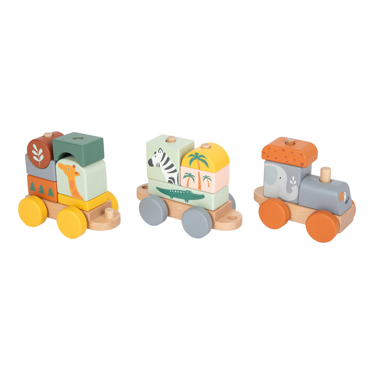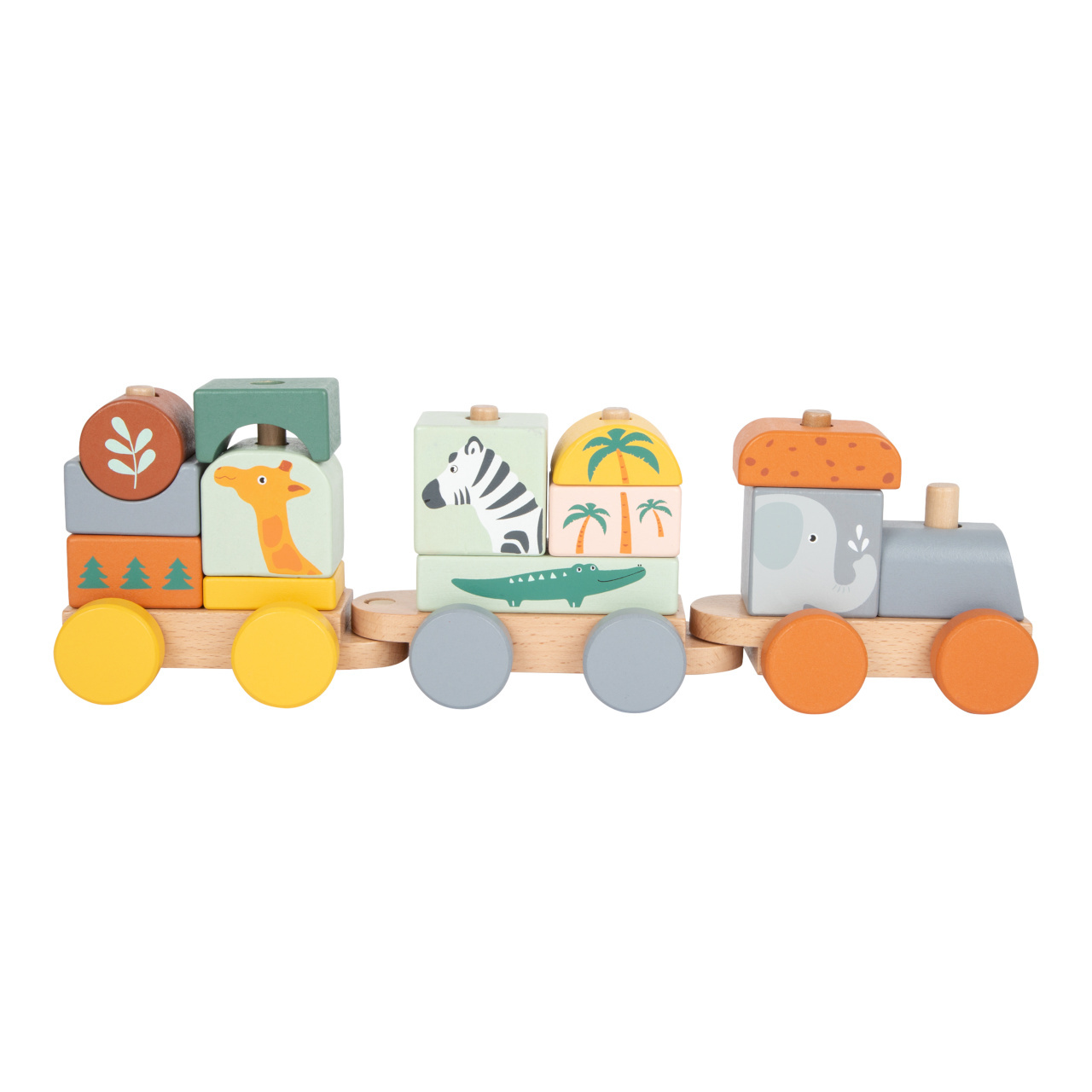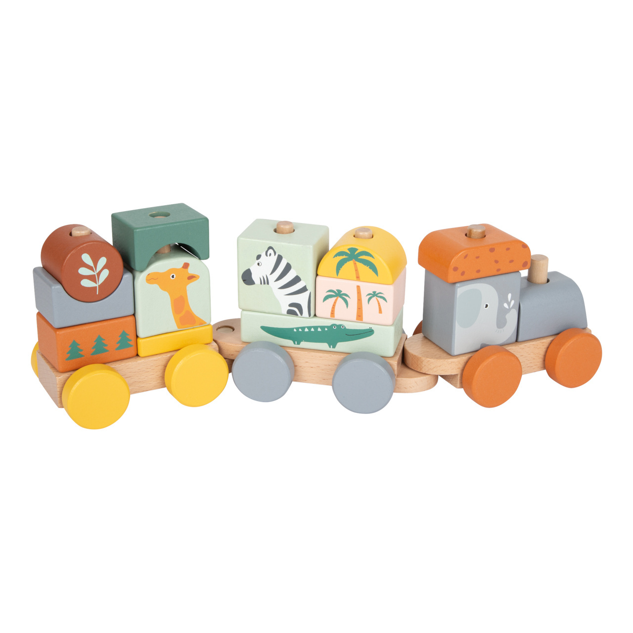 Složte jej a vyražte ze stanice! Tento dřevěný vláček v trendy barvách se rozjede až po nastoupení všech pasažérů – zebry, slona, žirafy a krokodýla. Vláček s mnoha detaily je zároveň nasazovací hračkou, která dává dětem volnost při skládání – každá kostka pasuje na více míst. Příští zastávka: Safari!