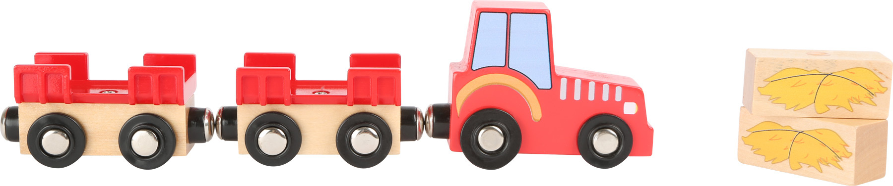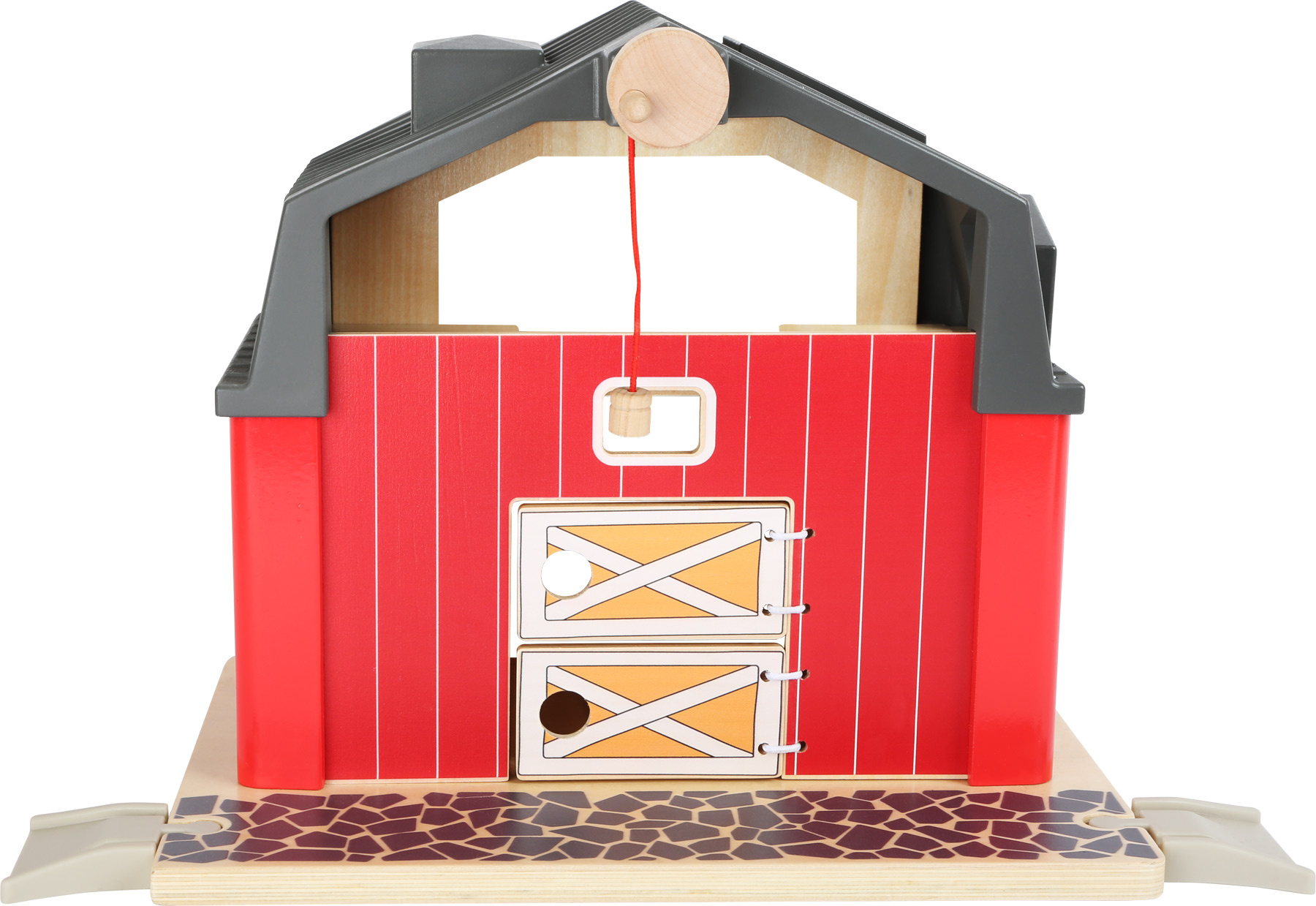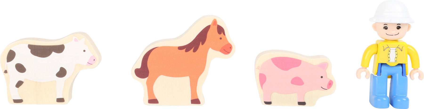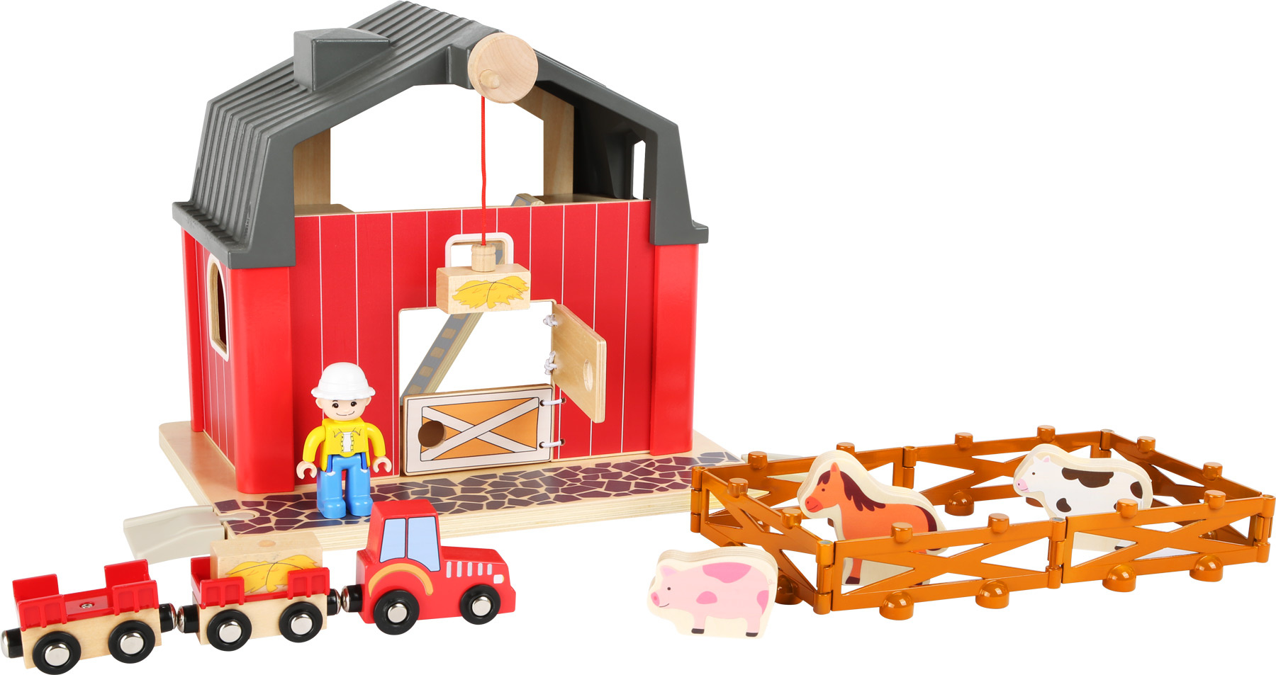 Vzrušující život na venkově! S touto farmou mohou děti zažít den plný zážitků s farmářem a jeho zvířaty. Farma ze dřeva a plastu obsahuje stodolu s dvojitými vraty, traktor s přívěsem a balíky sena, které lze přemisťovat pomocí magnetů. Sadu doplňuje kůň, kráva, prasátko a šest dílů ohrady. Budova stodoly má funkční jeřáb, kterým může farmář traktorem přivezené balíky sena uskladnit v suchu druhého patra. Posledním večerním úkolem je nakrmení zvířat, které jste dovedli z polí do stáje. Nezapomeňte zavřít bránu! Na tomto statku je opravdu živo, a tak si děti užijí spoustu rozmanité zábavy.