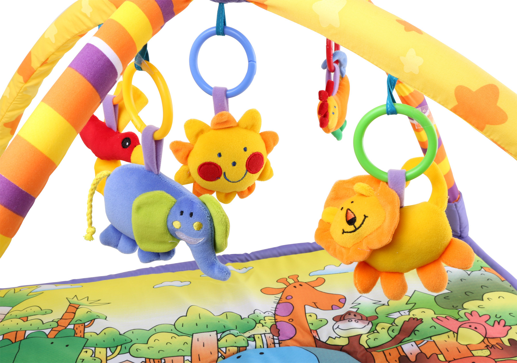 Kdo by nechtěl dovádět obklopený těmi nejroztomilejšími zvířátky! Příjemně měkká pestrobarevná podložka zdobená zvířecími motivy umožňuje nejmenším pohodlně ležet a hrát si s plyšovými hračkami pod klenbou z měkkých a pružných podpěr. Poutavé hračky různě chrastí, nebo pískají, přispívají tak k vývoji dětských smyslů a motoriky, motivují a postupně učí děti sedět. Jsou zavěšené na rozevíratelných kroužcích umožňujících jejich odepnutí, děti tak mohou mít své oblíbence vždy u sebe. Podložka je skladná a snadno rozložitelná, balená a dodáváná v praktické, snadno přesnosné plastové tašce.