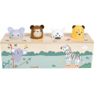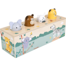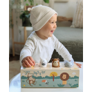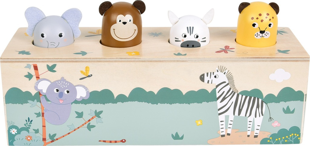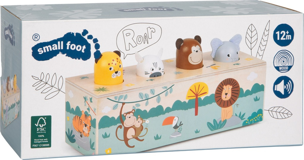 Tato interaktivní dřevěná hračka z FSC® 100% certifikovaného dřeva rozhýbe čtyři oblíbená zvířátka ze safari a navíc vydává reálné zvířecí zvuky! Stačí stisknout jedno zvířátko a ozve se jeho typický zvuk. Děti se tak hravou formou učí poznávat hlasy zvířat a zároveň objevují princip příčiny a následku. Čtyři detailně zpracované hlavičky – slon, opice, zebra a leopard překvapí děti veselým pohybem a autentickým zvukem při jemném stisku. Díky robustnímu dřevěnému zpracování, dětem přívětivým ilustracím a moderním safari designu je hračka nejen krásná, ale i odolná a trvanlivá. Hravý způsob, jak děti učit novým dovednostem, podporovat jejich zvídavost a přitom se skvěle bavit!