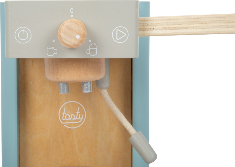 Kávové kapsle do kávovaru zapadnou pomocí boční páčky, kuželovitý tvar kelímků zajistí, že kapsle spadne přímo do nich. Magnetický napěňovač vám poskytne mléko do kávy. Napěňovač je vyroben z drátku obaleného v textilu, ohýbá se do všech stran a na konci má magnet, na který můžete připevnit mléčnou pěnu. Tato sada má barevný design kompatibilní s dalšími produkty řady Tasty od Small Foot, například Dřevěnou kuchyňkou LE12216.