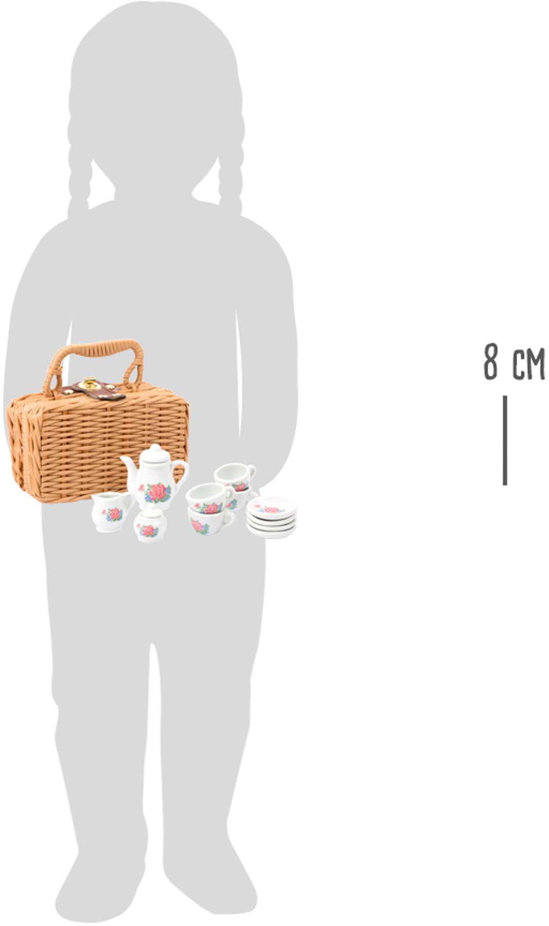 Sada 14 kusů porcelánového nádobí na přípravu kávy v bílé barvě s romantickým potiskem v proutěném kufříku s organizérem. Sada obsahuje velkou konvičku, konvičku na mléko, cukřenku, 4 šálky s podšálky a kufřík. Piknik pro panenky může začít! Porcelánová kávová souprava je potištěna krásnými růžemi a skvěle se hodí pro relaxační kruh kávy na piknikové dece. Pouzdro na přenášení zdobené červeno-bílou kostkovanou látkou je opatřeno límcem se šroubovací špičkou, aby byla porcelánová souprava při přepravě bezpečně uložena.