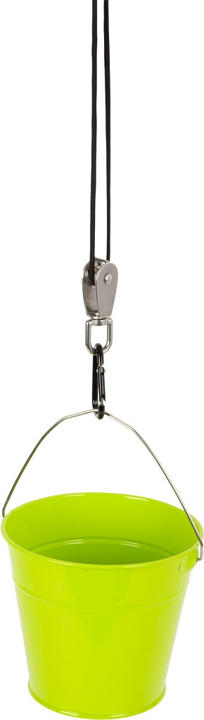 Do zahradního domečku, domu na stromě, na prolézačky nebo kamkoliv jinam! S tímto kladkostrojem se silným lanem a kovovým kyblíkem si mohou mladí dobrodruhové dopravit jakýkoliv náklad na tato zmíněná vyvýšená místa a zase zpět dolů. Děti tak nemusí opakovaně lézt nahoru a dolů. Je to zábavná hračka, která trénuje zručnost. Kovové ucho je navrženo tak, aby se karabina s lanem neposouvala. Děti se naučí, jak funguje kladkostroj a budou moci jednoduše hýbat těžkými náklady. Perfektní hračka na zahradu.